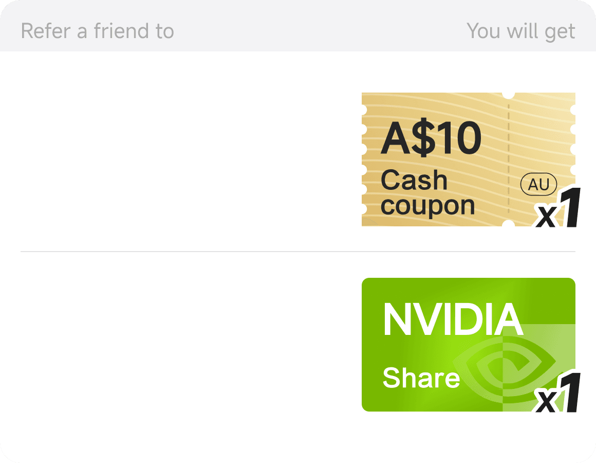 T&Cs apply. *T&Cs apply. To receive 1 free NVIDIA share, the referred friend must deposit at least A$2,500, maintain the required asset balance for 30 days, and execute at least one eligible trade.