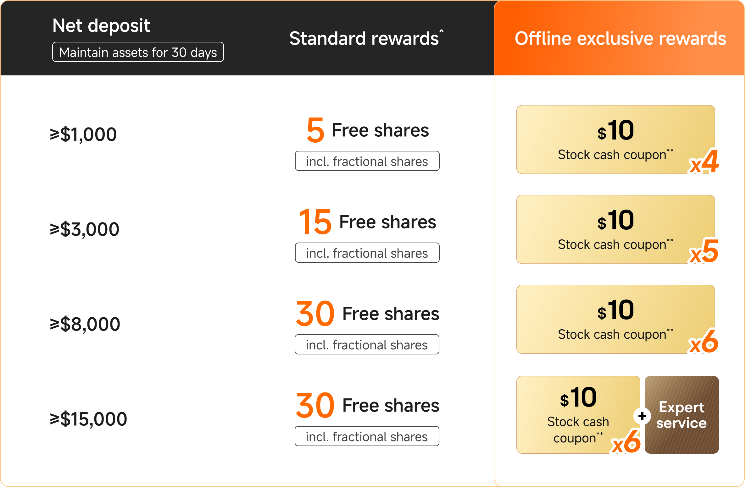 This offer is only available to New Clients who sign up in person at our new Chatswood store (as defined in the Terms and Conditions). New Clients who successfully complete new deposits of AUD $1,000, $3,000 and $8,000 will receive $10*4, $10*5 and $10*6 stock cash coupons.