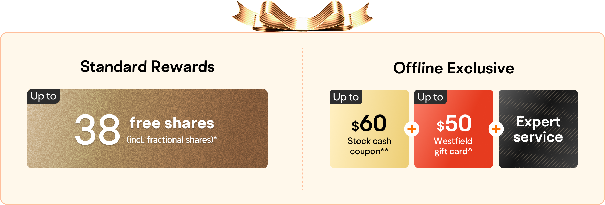 T&Cs apply. *Deposit $1,000/$3,000/$8,000/share on social media and maintain account balance for 30 days to earn 5+10+15+8 random free fractional or whole US shares, probability-weighted average value $2.88/share as of 24/7/2025. **The stock cash coupon is valid for 14 days, only applicable to AU & US stock buy orders above AU$100 or equivalent, and provides a cashback upon use. ^Only on Monday, users who deposit $8,000 in store can get a extra $50 Westfield gift card.