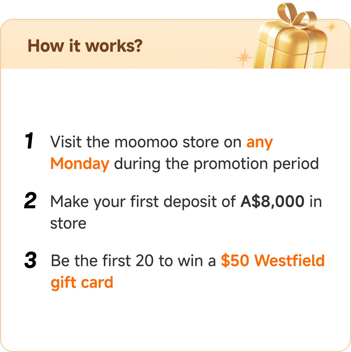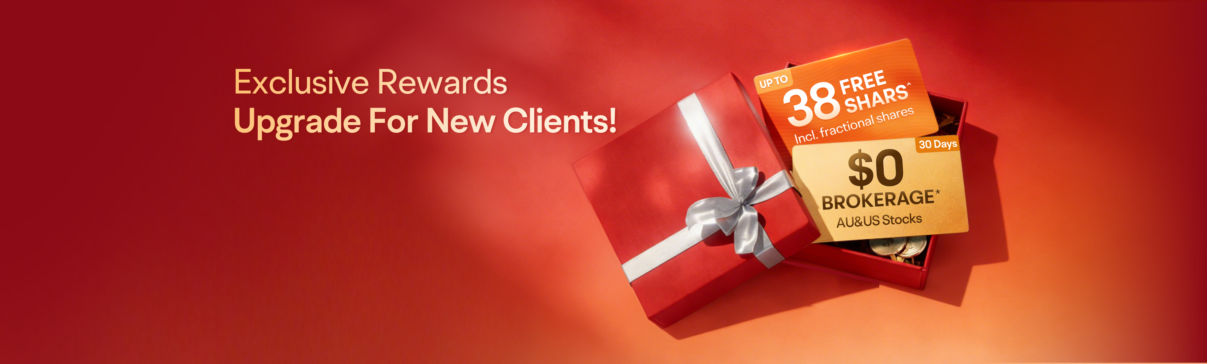T&Cs apply.*Brokerage-free cards applicable to AU and US stocks only. Excluded pass-through fees and FX costs. The brokerage-free card must be activated within 60 days of receipt and is valid for 30 days after activation. ^Deposit $500/$2,500/$8,000/share on social media and maintain account balance for 30 days to earn 5+10+15+8 free fractional and whole US shares, probability-weighted average value A$2.88/share as of 24/07/2025. **Offer available to new clients only for uninvested cash balance of up to A$80,000 daily. Standard variable rate applies for excess amount and after 30 days. Rates may be subject to change. Moomoo is not a bank and Cash Plus is not a deposit account.