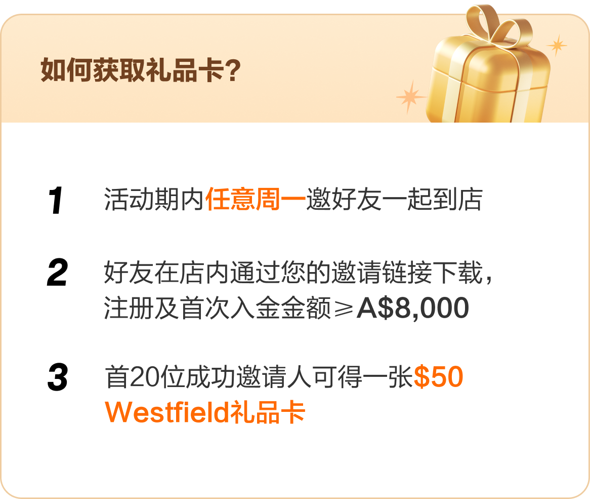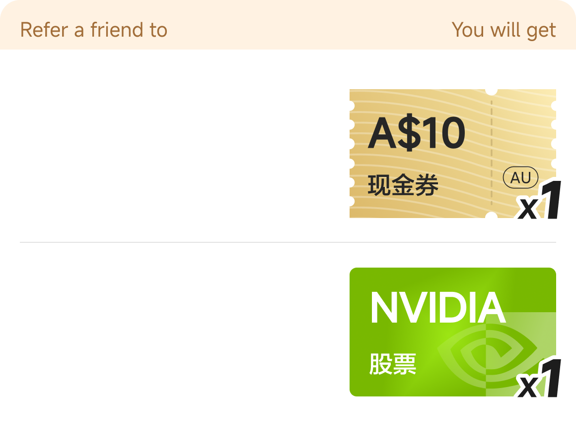 条款和资格适用。*邀请好友成功并满足条件(入金≥A$2,500、资产维持30天、完成1笔交易),即可获得 1 股英伟达股票奖励。每人最多领取 20 股。