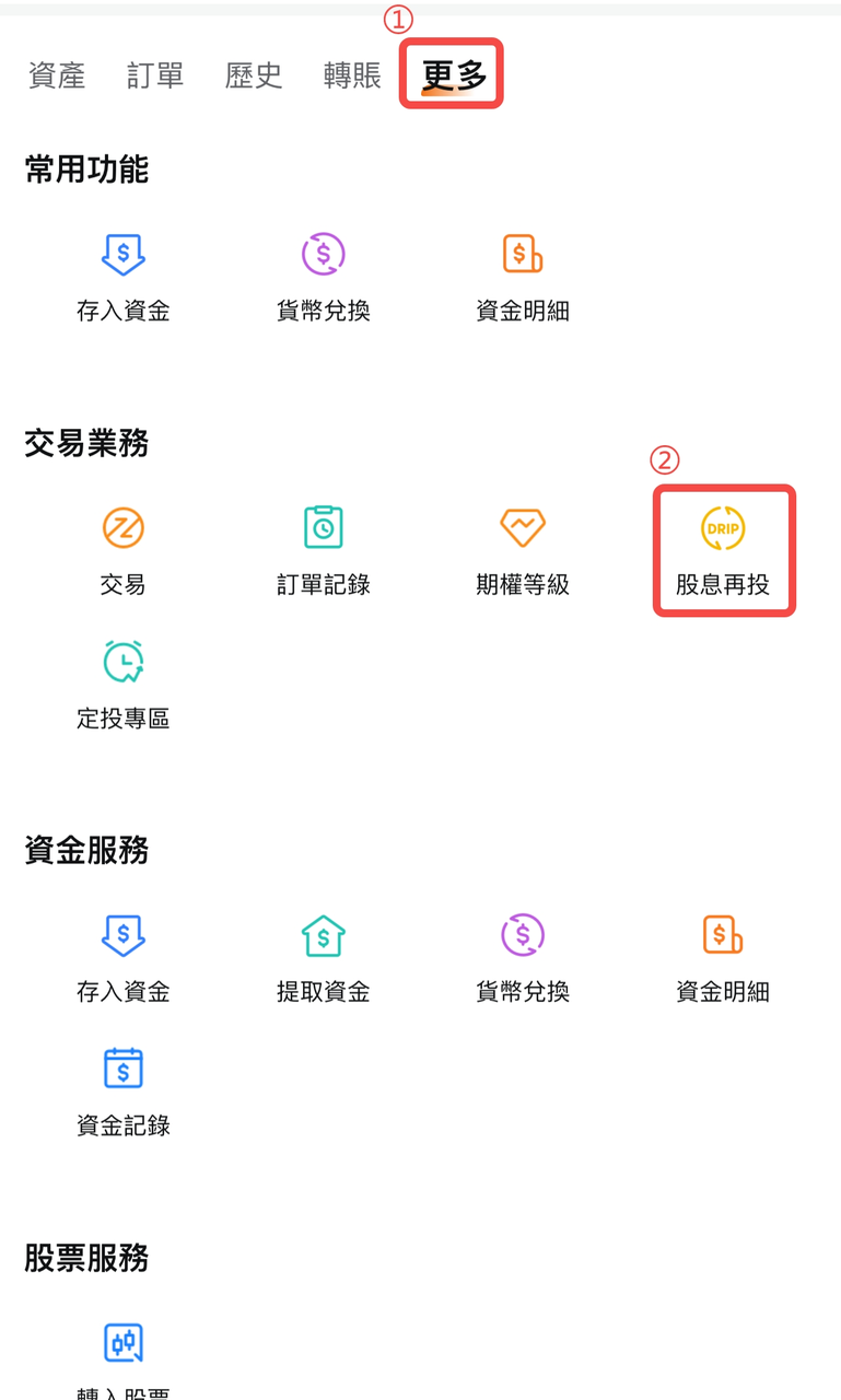 路徑:「帳戶」-「更多」-「交易業務」-「股息再投」
