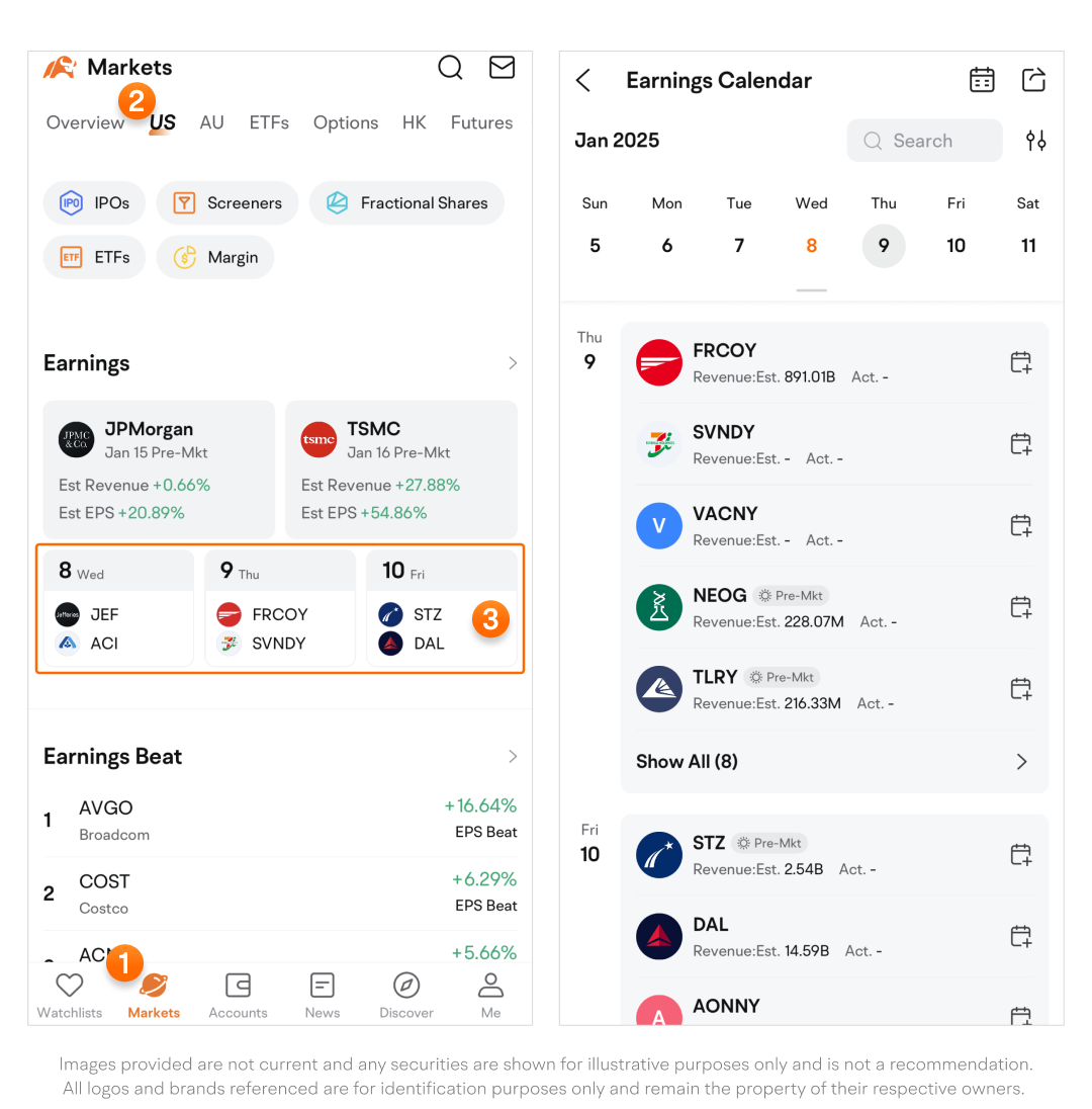 Path: Markets > US or select another market > Swipe up to find Earnings > Tap the calendar section to access Earnings Calendar.