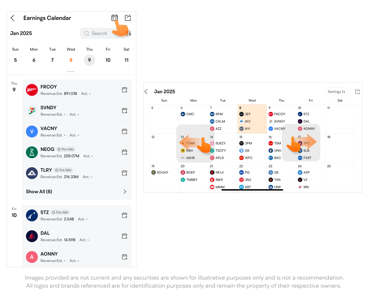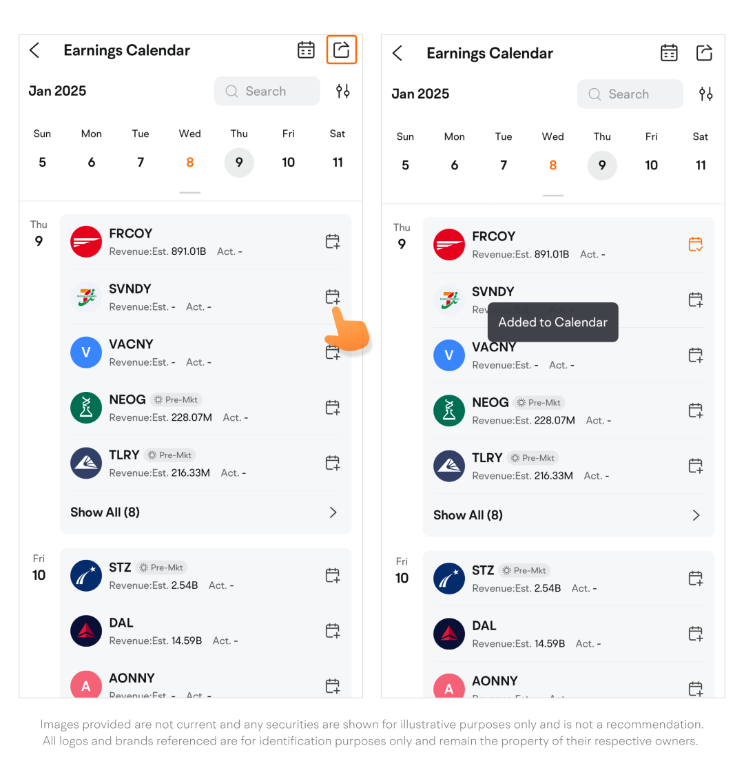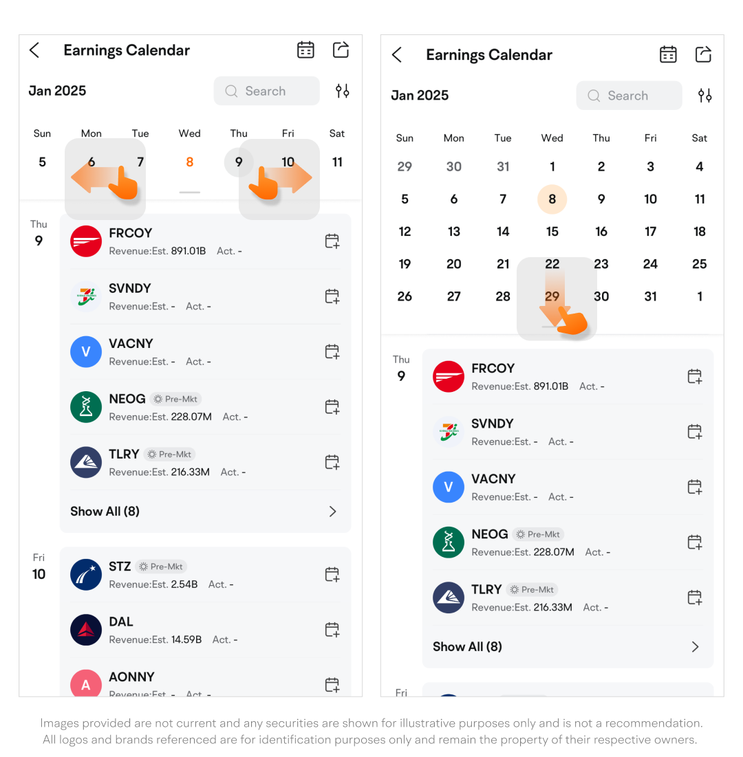 Tap a specific date to view the list of companies scheduled to release earnings reports on that day.