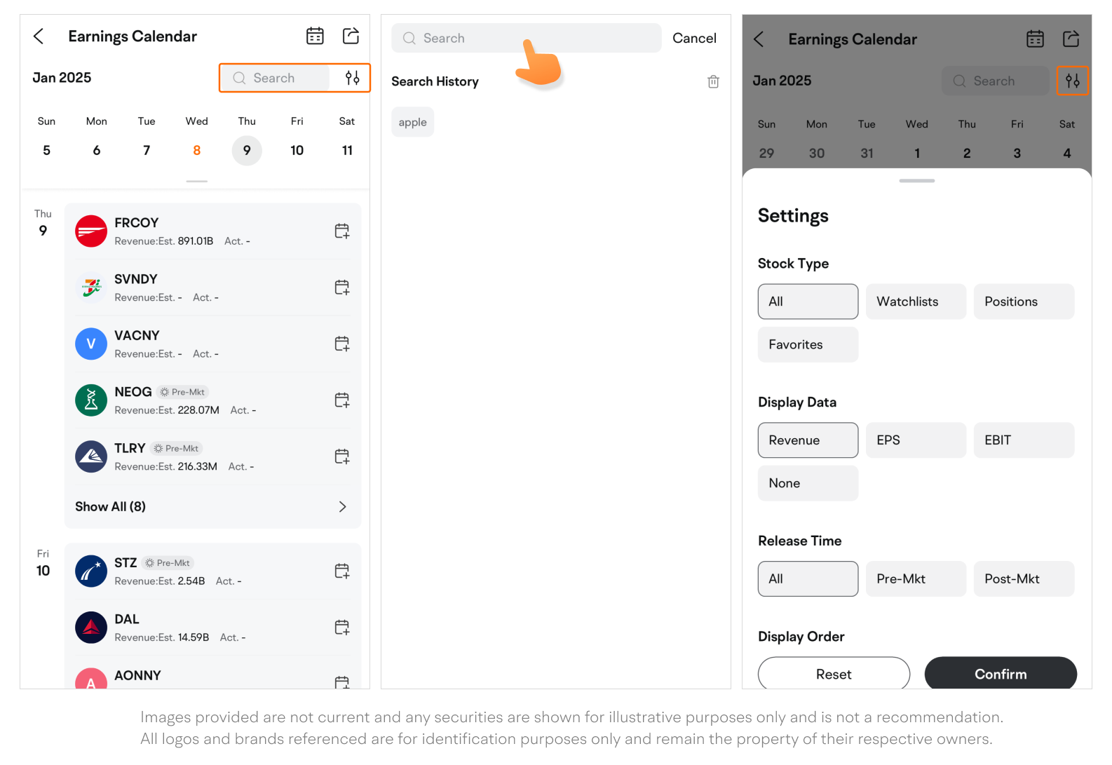 Next to the search bar is the filter icon. Tap it to filter items by stock type, release time, market capitalisation. Customise the displayed earnings data under each company, and sort items into a preferred order.