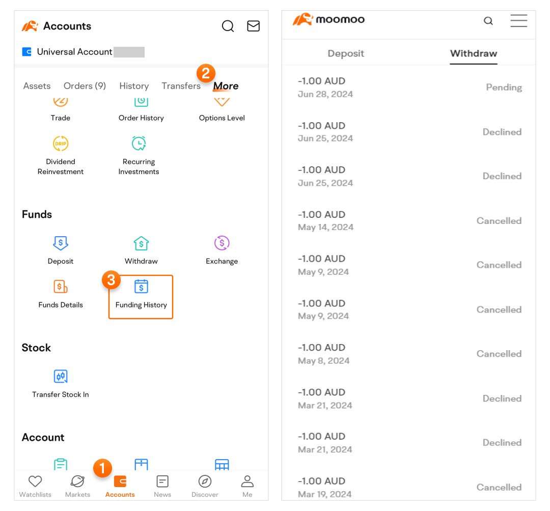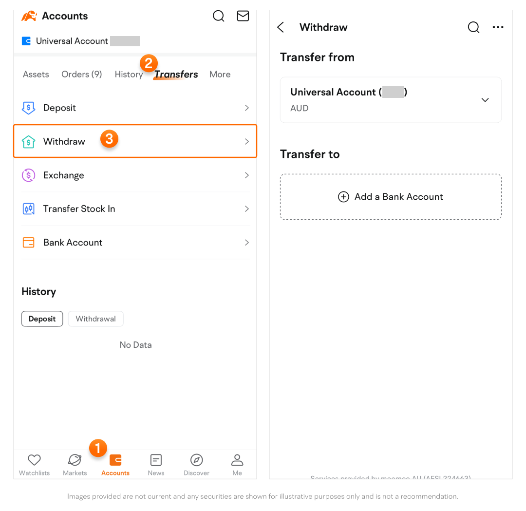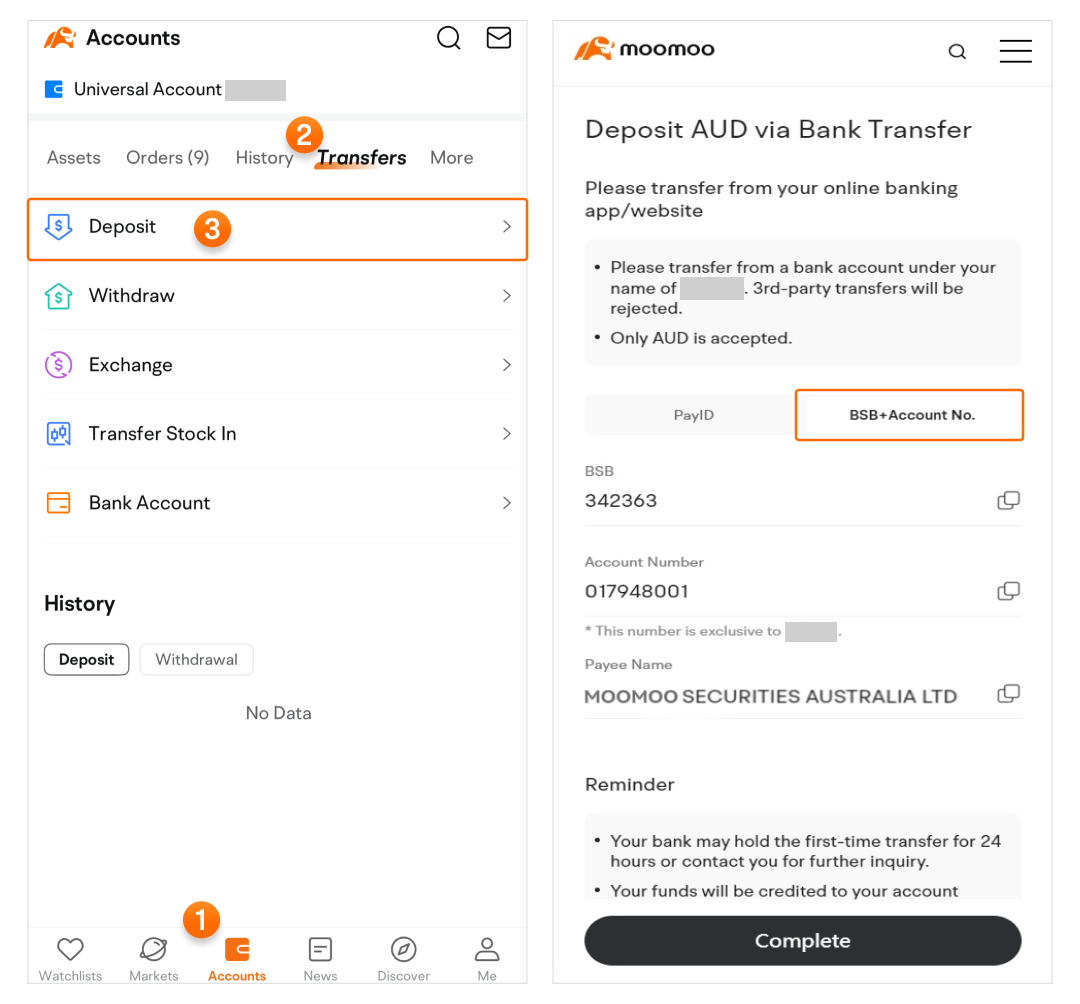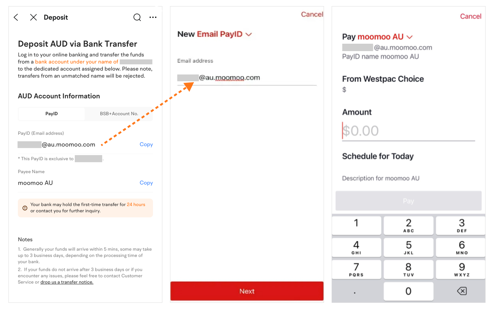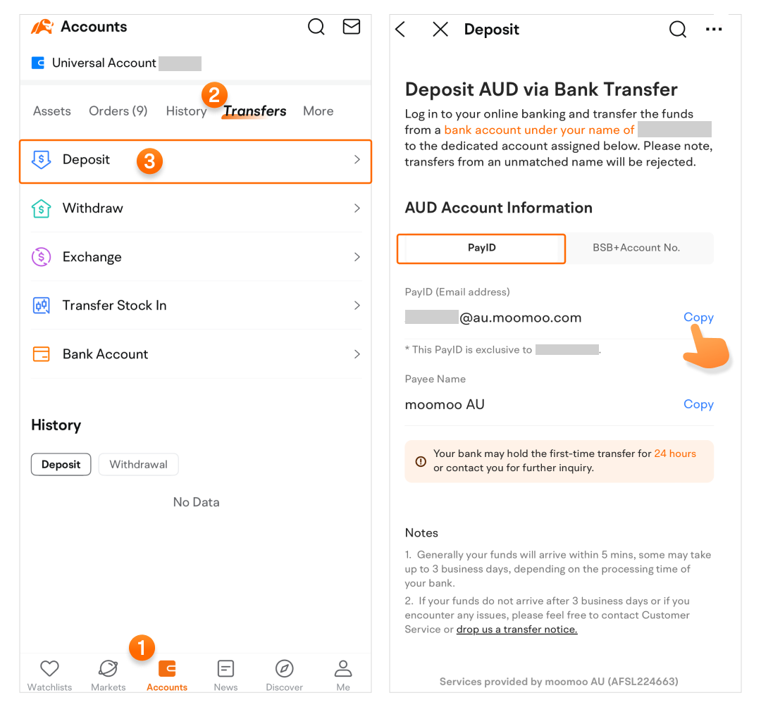 Path: Accounts > Tap an account card > Transfers > Deposit > Pay ID. Then Copy the PayID provided by moomoo in your bank App/online banking.