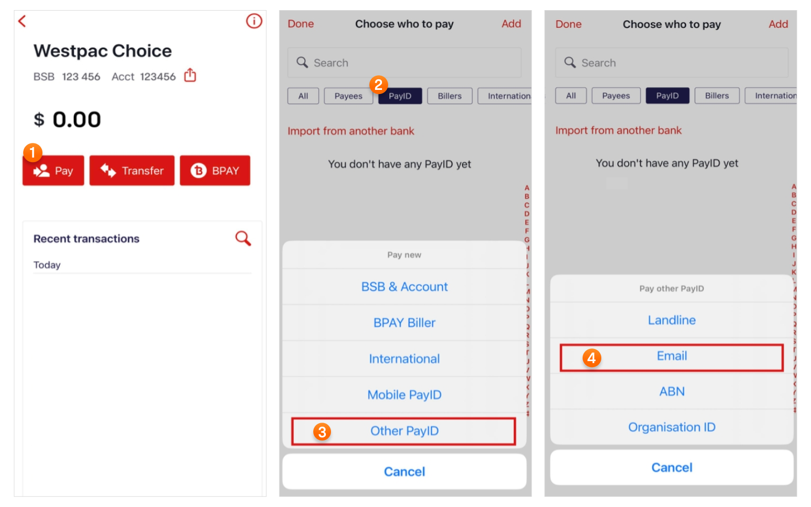 Open your Westpac App, tap “Pay” to find the PayID feature, and select Email as the type of PayID.
