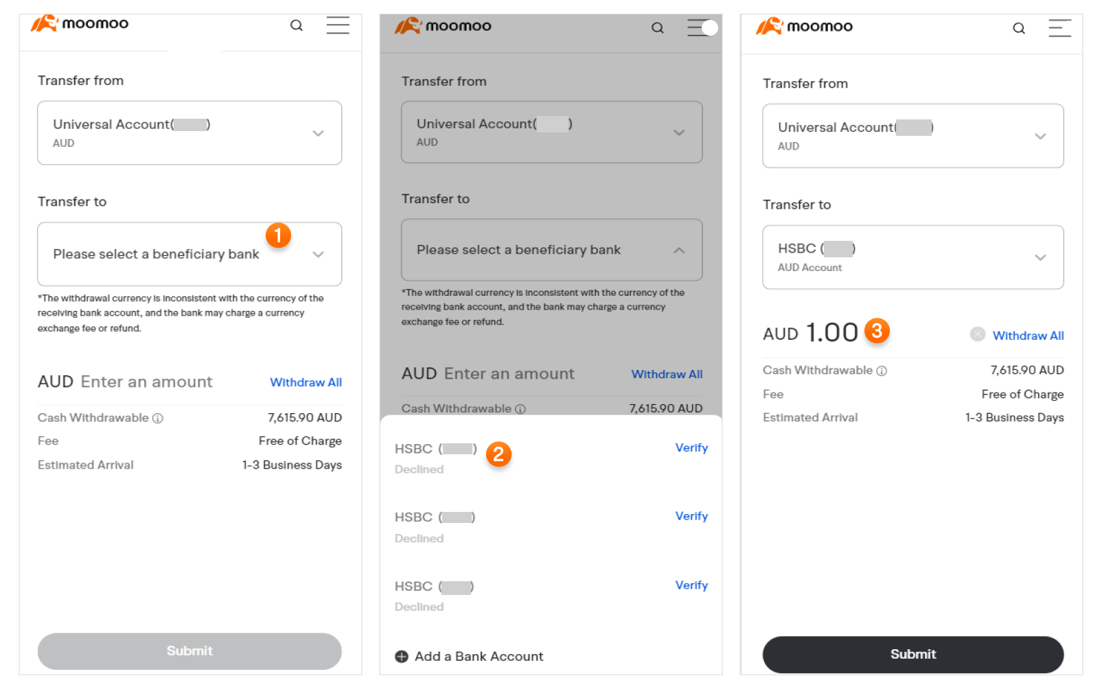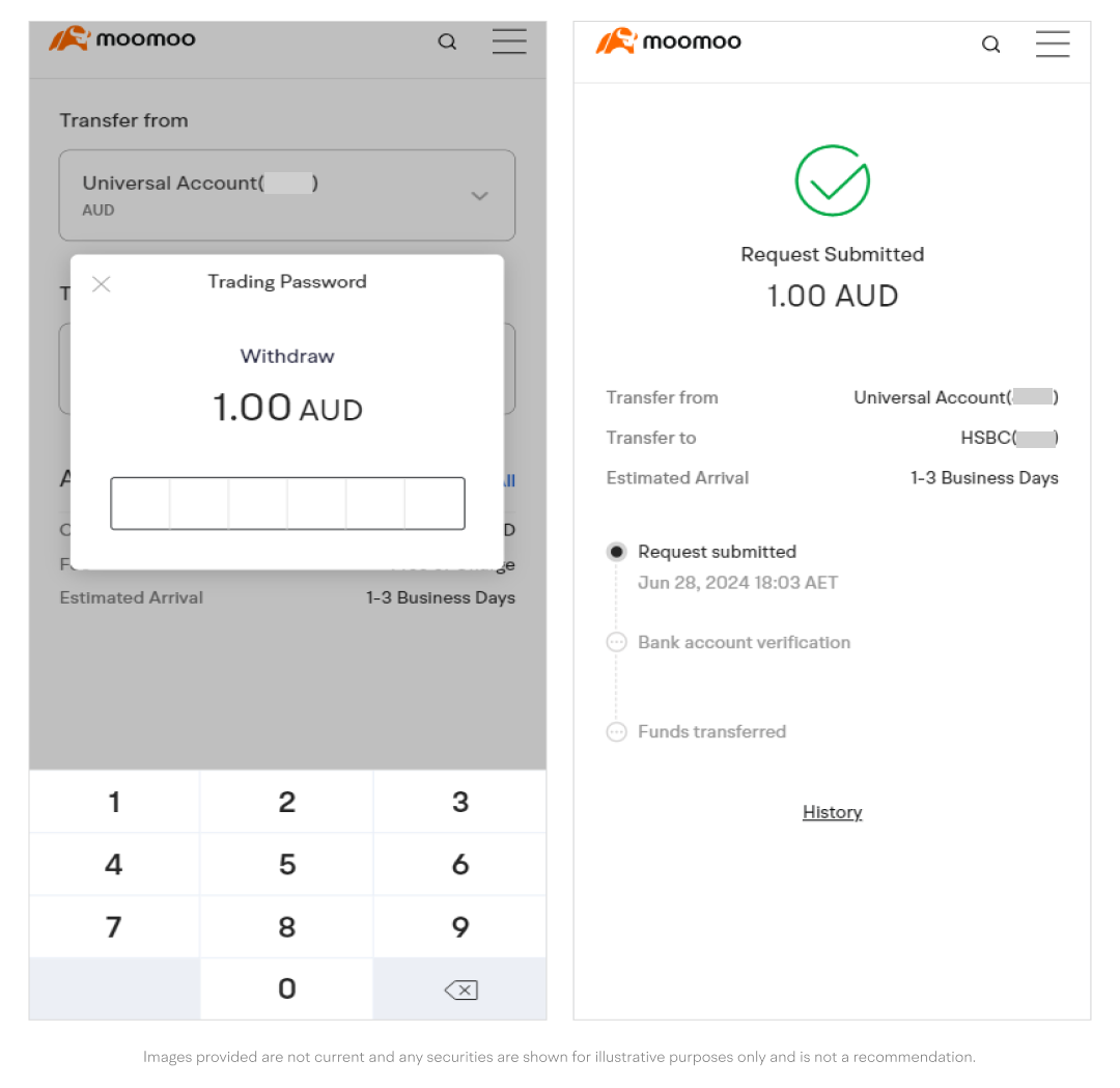 Please ensure your bank account name is the same as your moomoo account name. For example, your moomoo trading account is in the name of ABC, then your must ensure the payer's bank account name is also ABC. Moomooo may request more information from you if account names are unmatched which may result in a delay in the arrival of your funds.