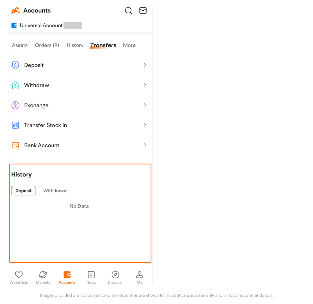 Path 1: Accounts > Transfers > Go to the History section at the bottom of the page > Tap to switch between Deposit and Withdrawal.