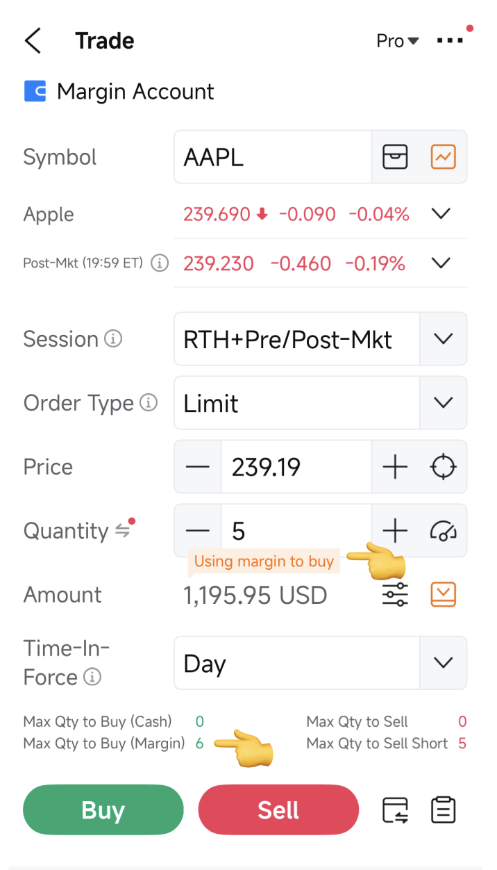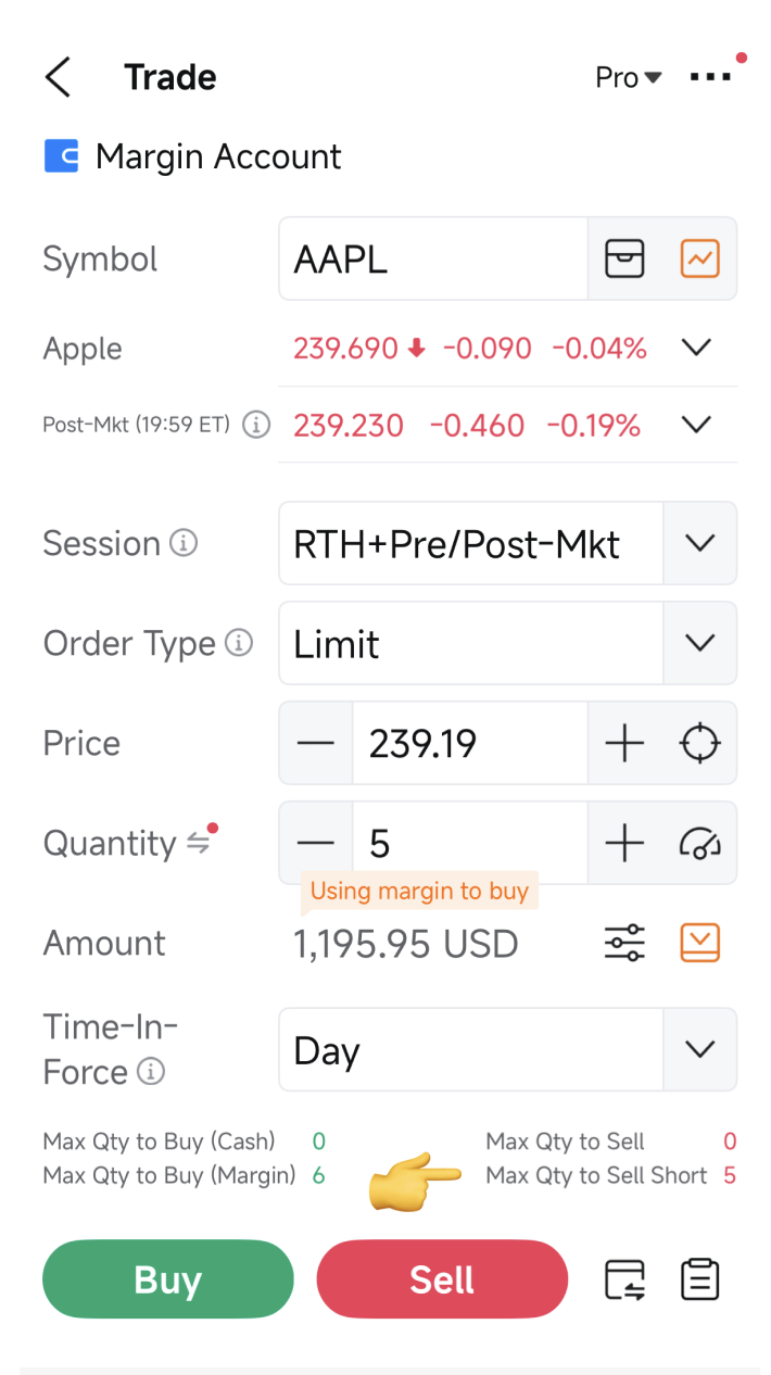 Short selling: The maximum number of shares you can borrow depends on the initial margin requirement and your account assets. When you do not have enough cash, the system will automatically calculate your account assets that can serve as collateral, including but not limited to cash, holdings, funds on hold.