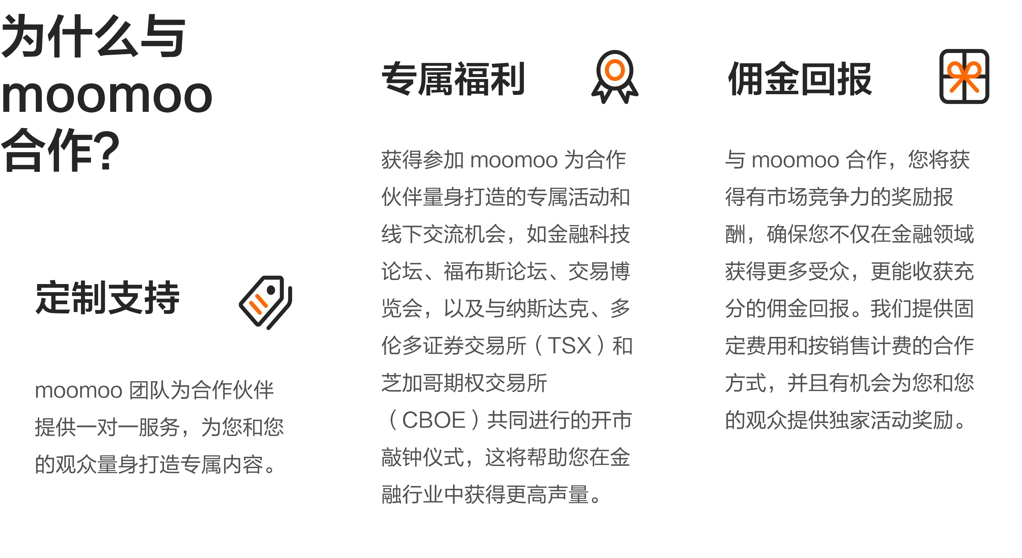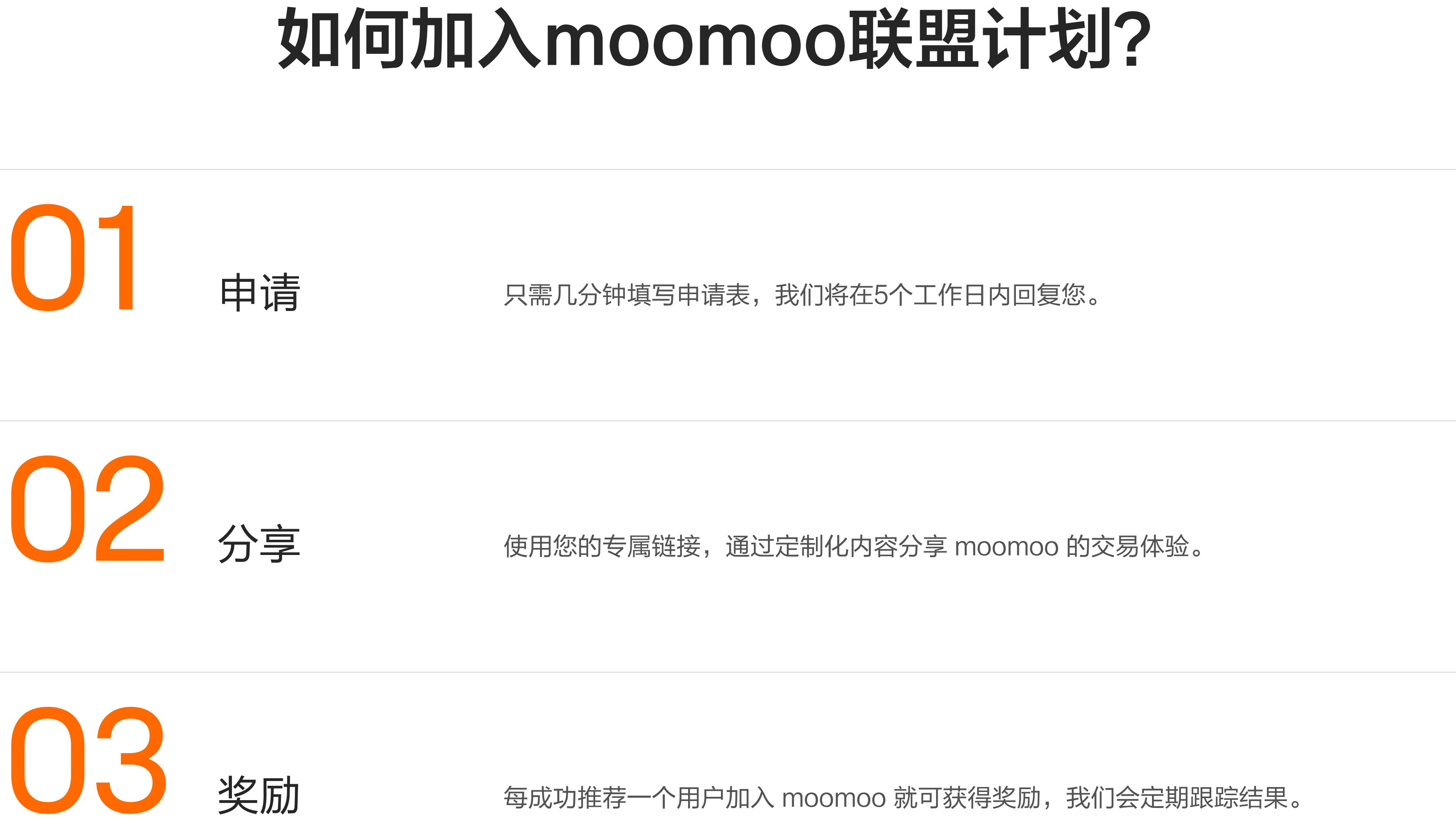 这是一个与 moomoo 合作的机会。向您的观众推广 moomoo 并分享您的联盟链接。一旦他们通过您的链接开设账户,您将获得佣金或现金奖励,同时您的观众也能通过参加 moomoo 活动获得新客福利。