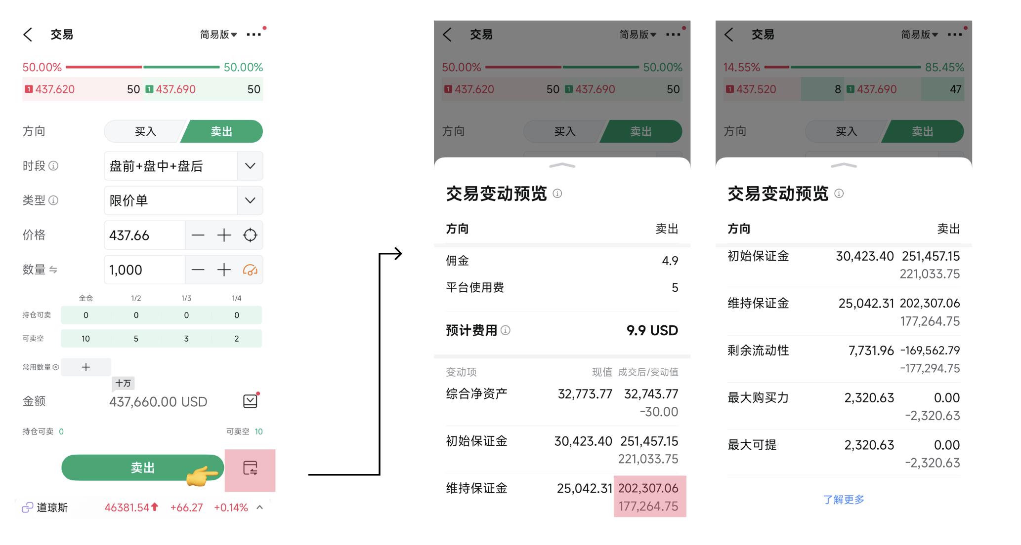 當您進行融資融券交易,或者進行含期權交易時,您可參考moomoo CA的交易預覽功能,我們計算並提供了您該訂單以當前條件和市況成交後,對帳户資產,保證金,購買力,剩餘流動性等的影響。