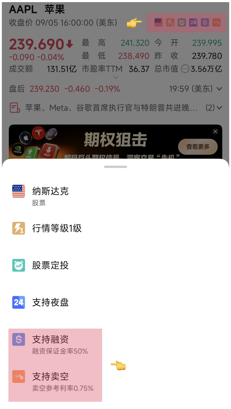 您可在報價頁面直接查看某隻股票是否支持融資或融券。