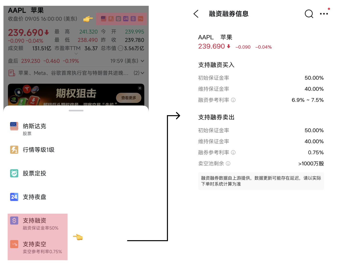 您可通過點擊報價頁面icon,直接查看某隻股票融資融券的保證金率和對應利率。