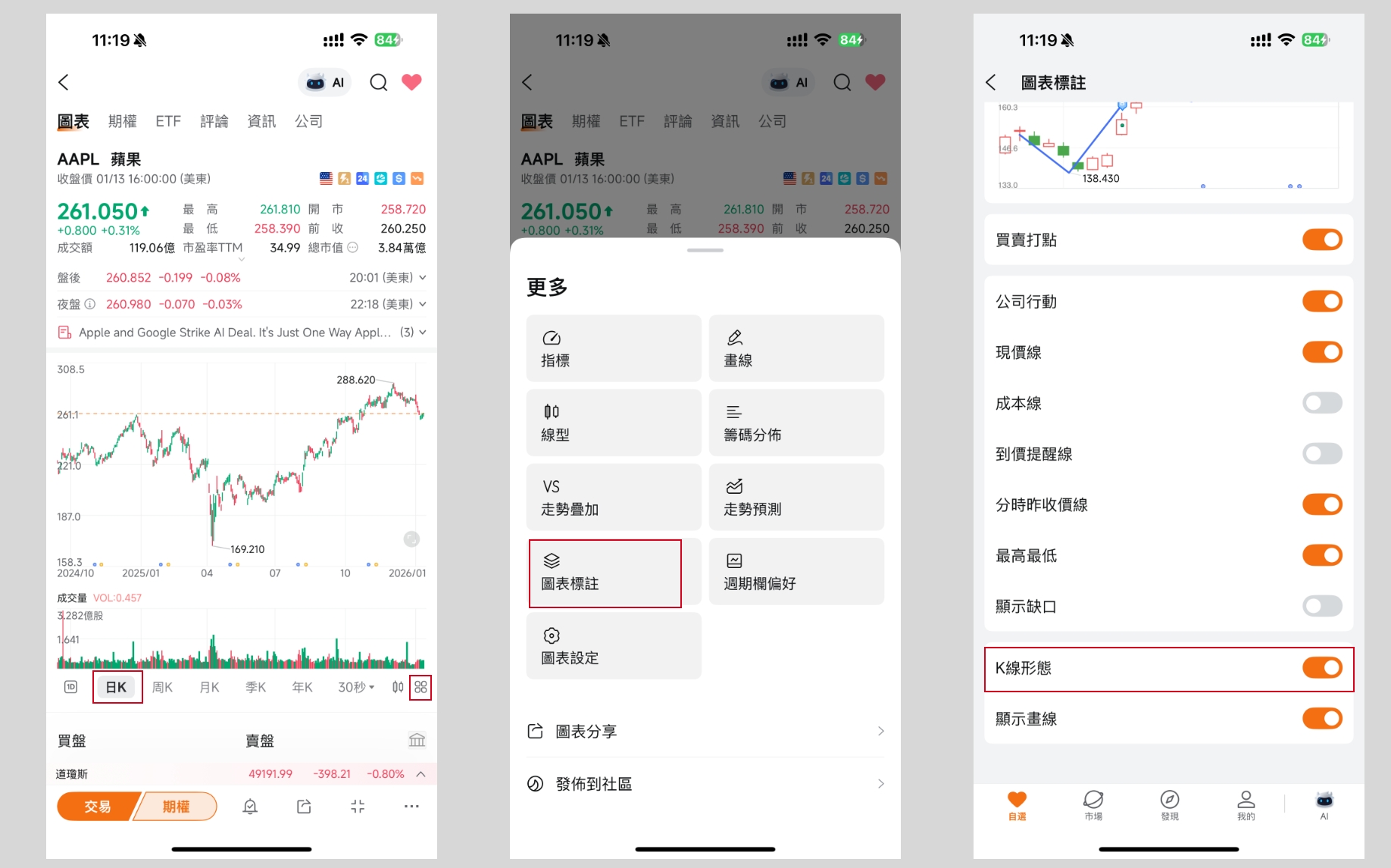● 入口:個股頁 > “圖表” > “日K” > 工具箱圖標 > “設定” > “K線標注” > “K線形態”