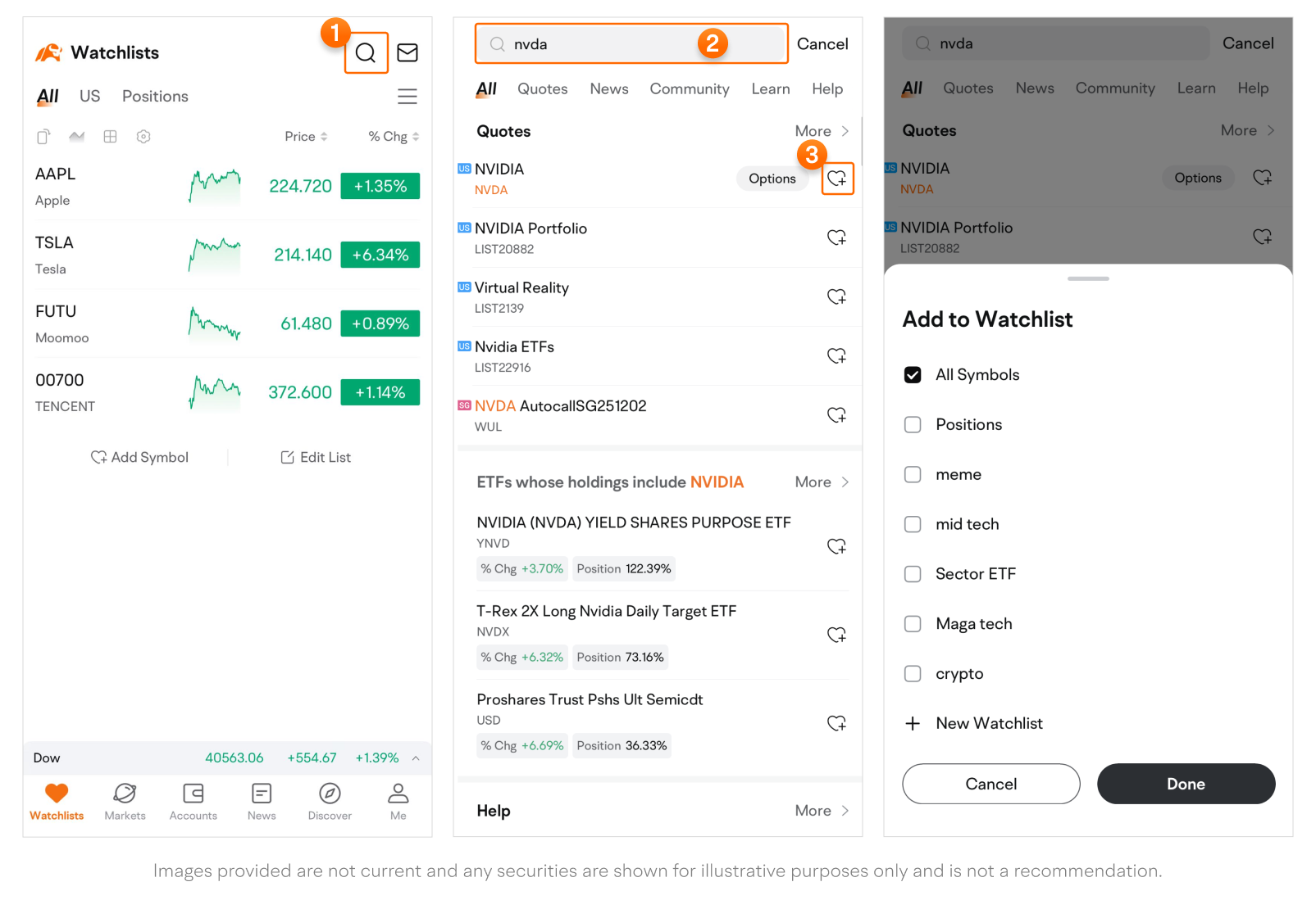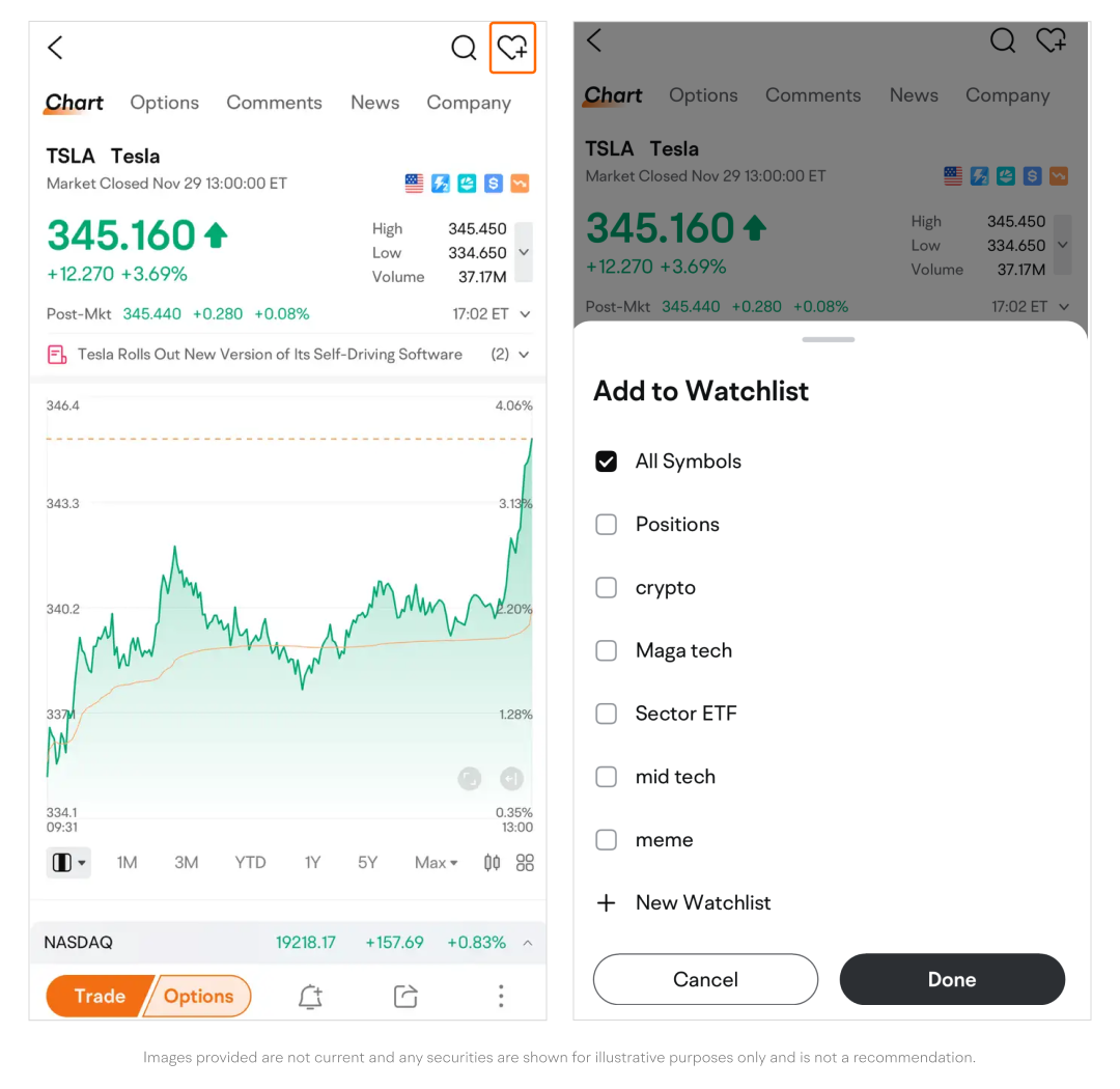 • An action sheet will pop up from the bottom of the page, allowing you to select the watchlist(s) to which you want to add symbols. Tap Done to finish.