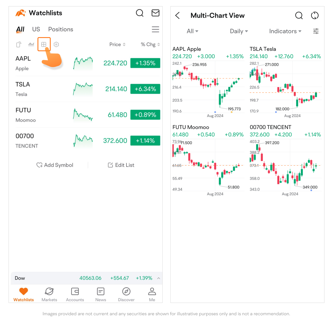 The multi-chart view allows you to view the quotes of multiple stocks at the same time.