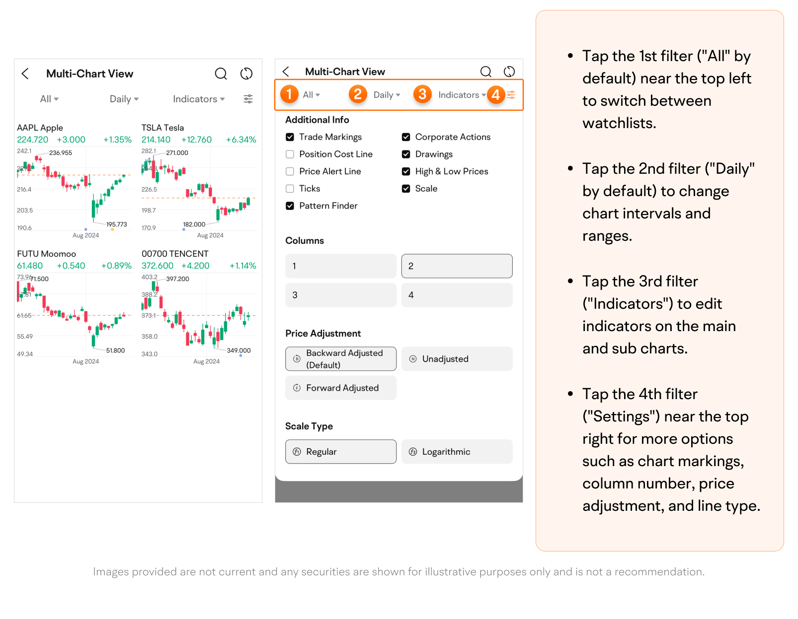 • Tap the 4th filter ("Settings") near the top right for more options such as chart markings, column number, price adjustment, and line type.
