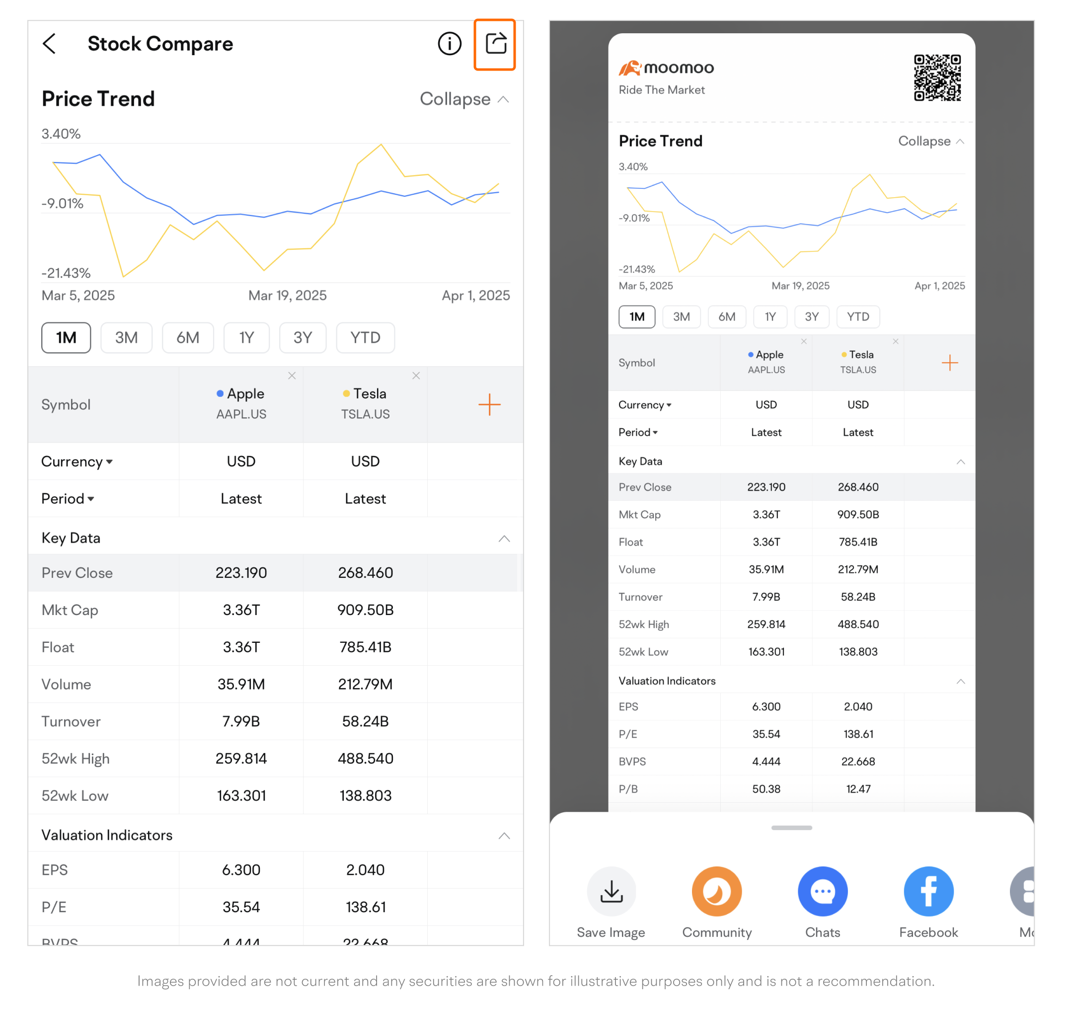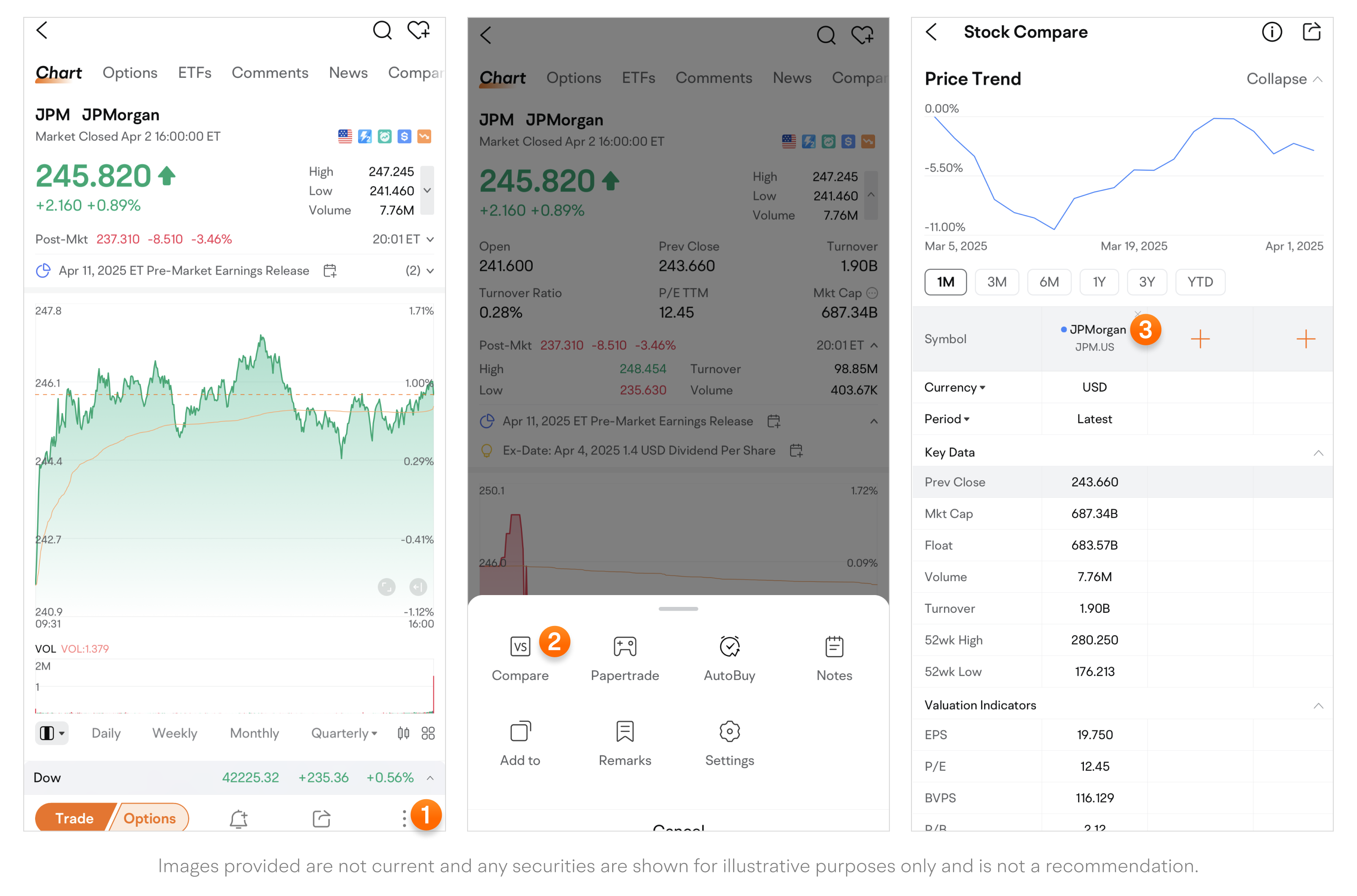 Use the Compare feature to easily contrast and analyze multiple symbols side by side. You can compare price trends, key financial indicators, and more.