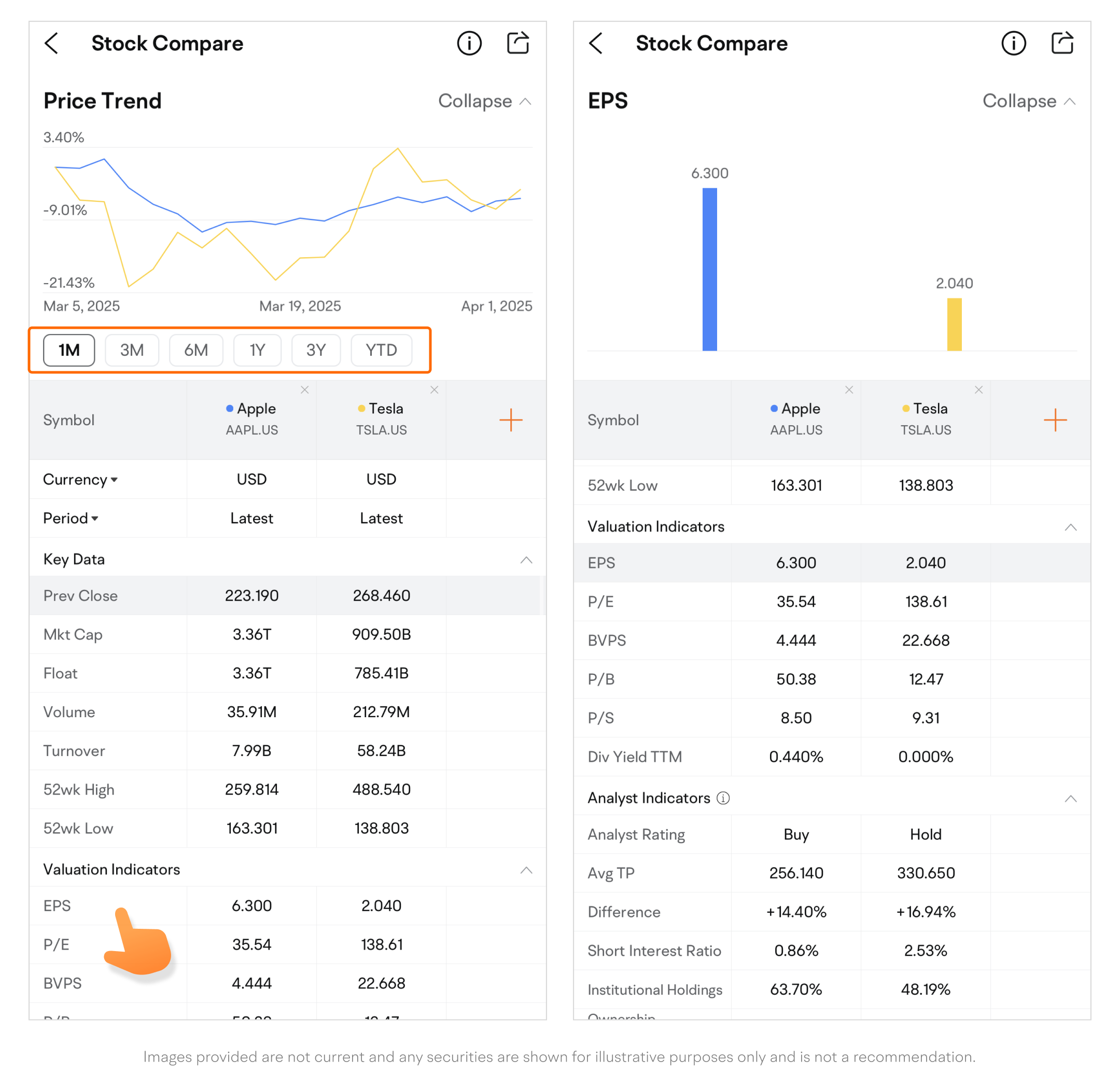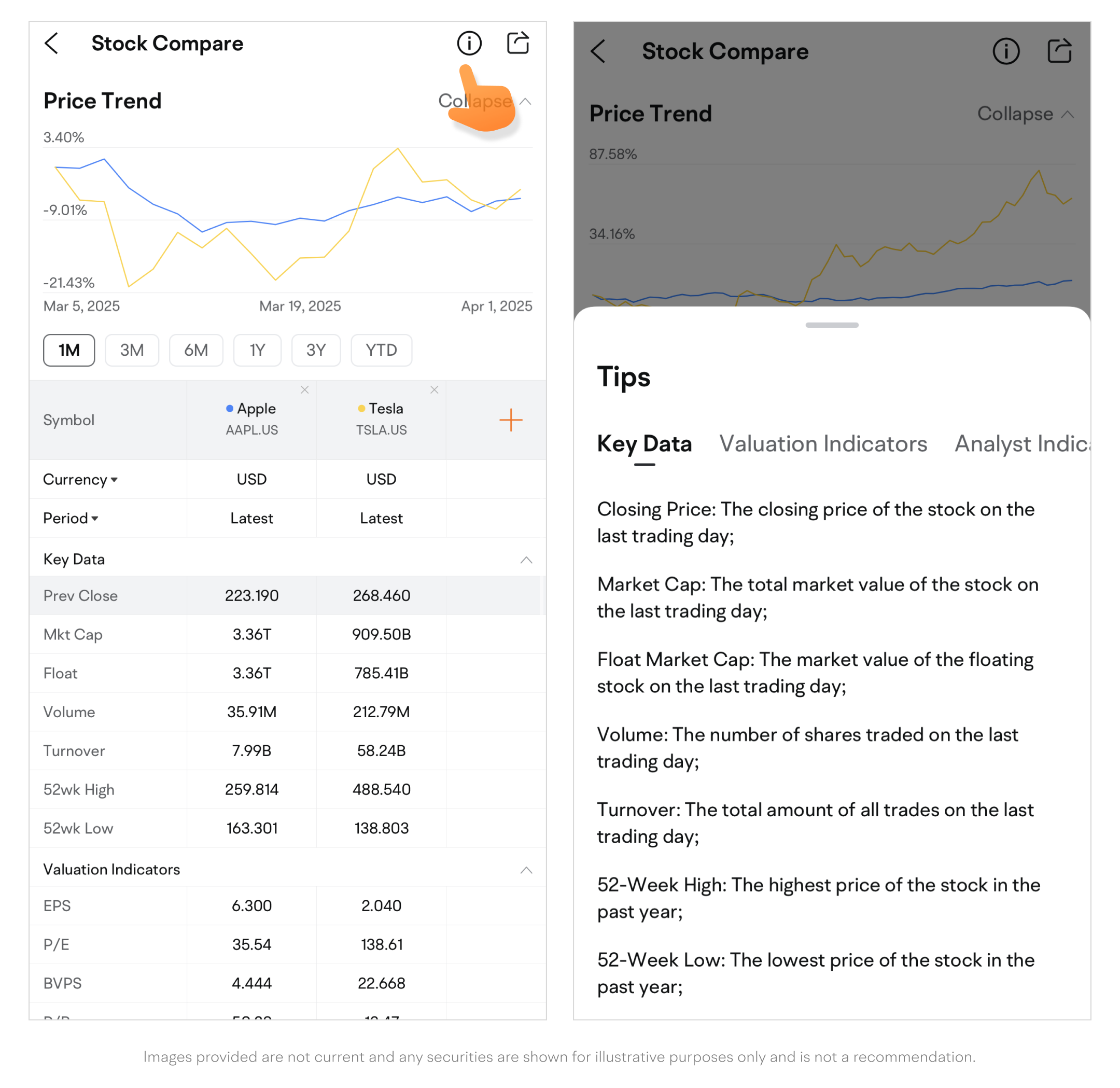• Tap the options such as 1M and YTD at the bottom of the price trend chart to switch time ranges.