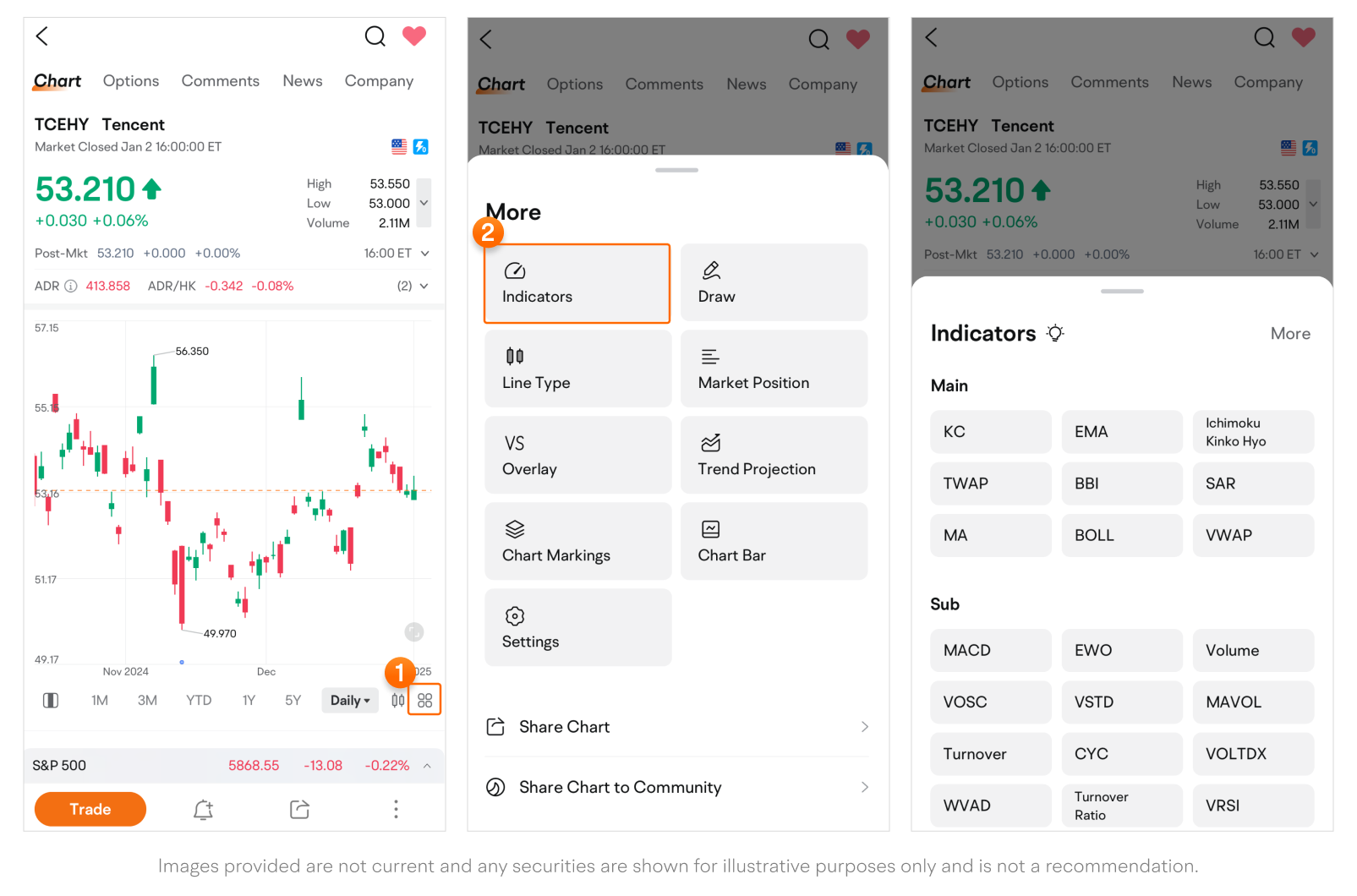 Path: Quotes page > Tap the "more" icon from the chart bar > Indicators.