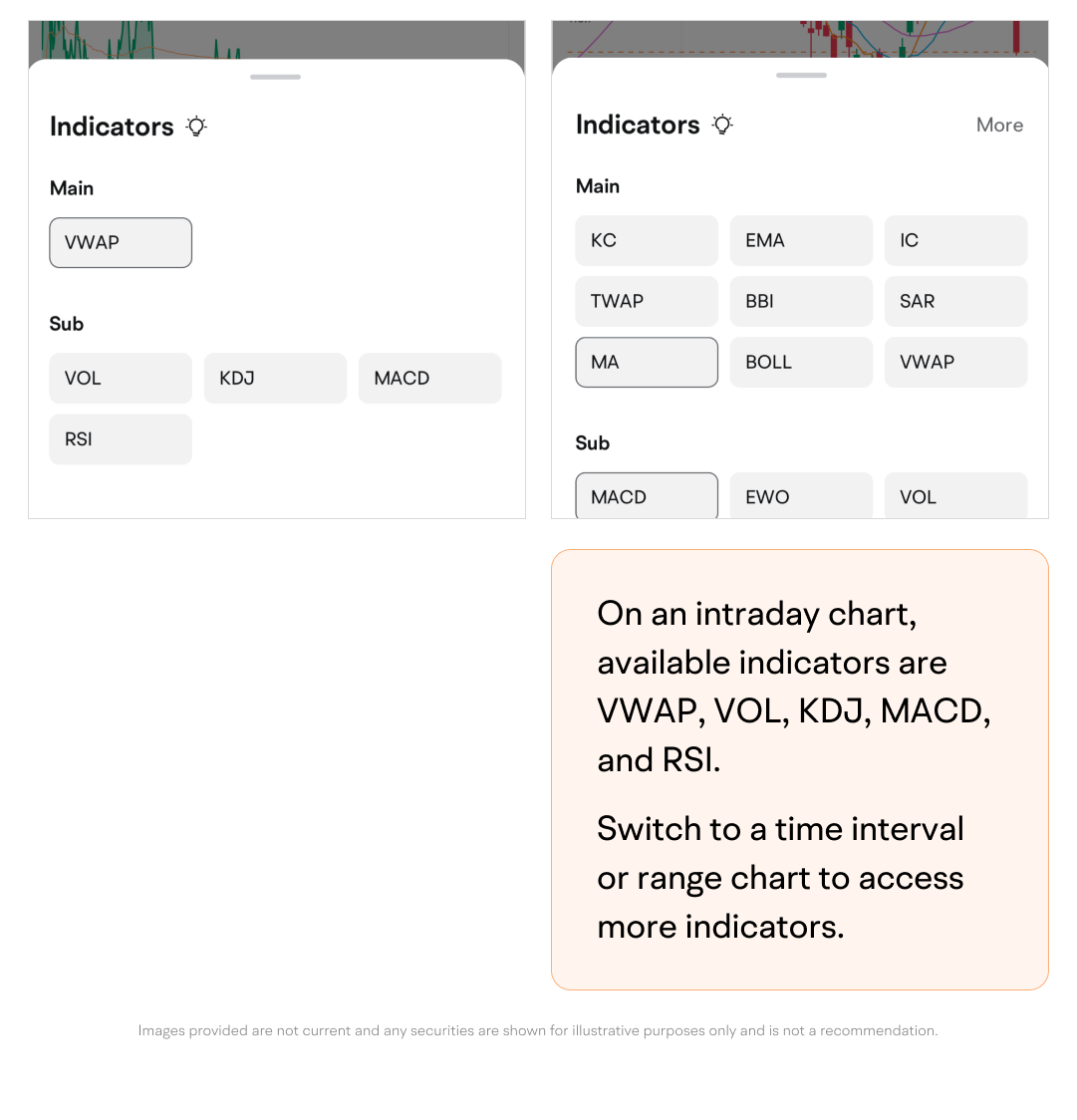 Moomoo offers a suite of technical and financial indicators for both main and sub charts to support your analysis.