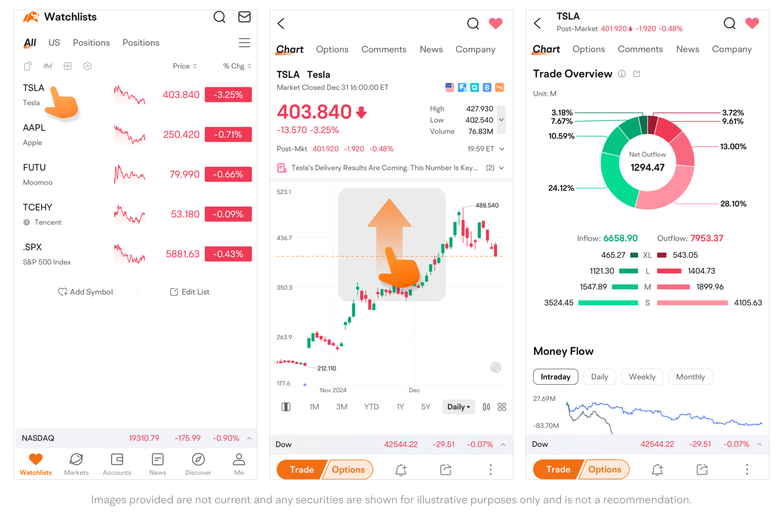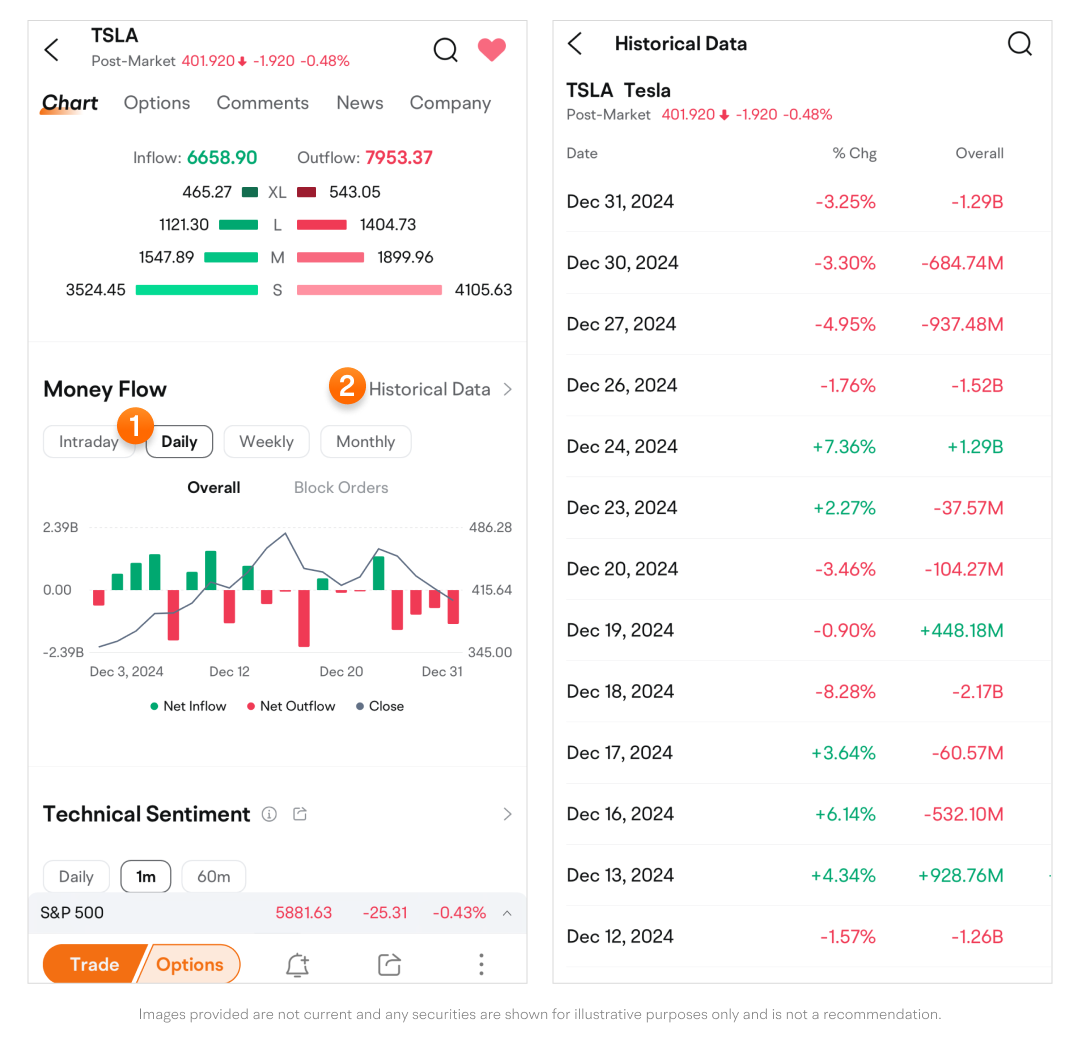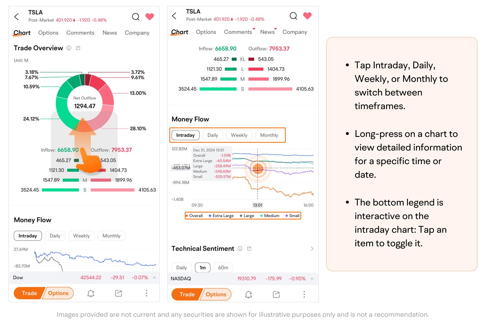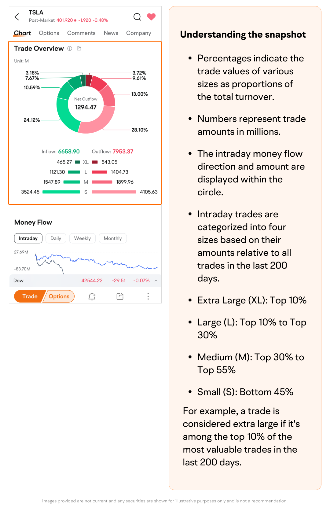 Path: Quotes page > Swipe up to find Trade Overview and Money Flow.