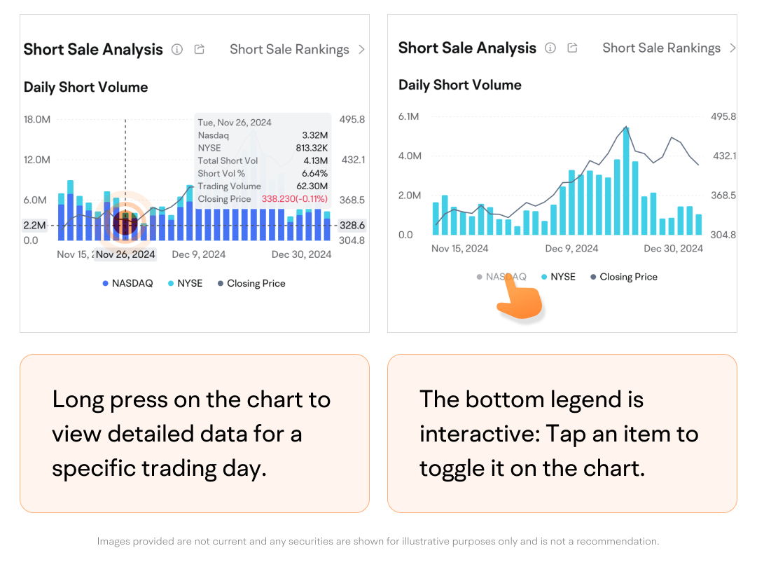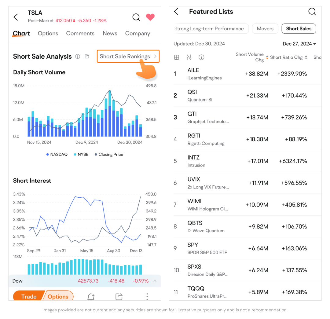Path: Quotes page >Chart > Swipe up to find Short Sale Analysis.