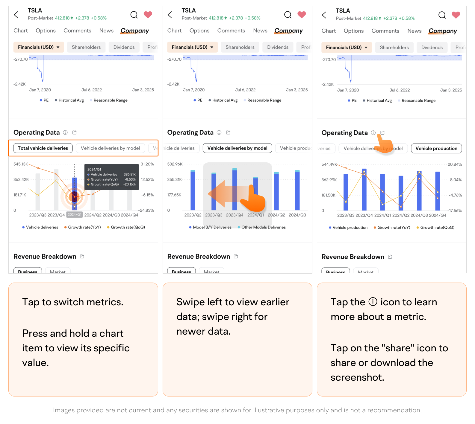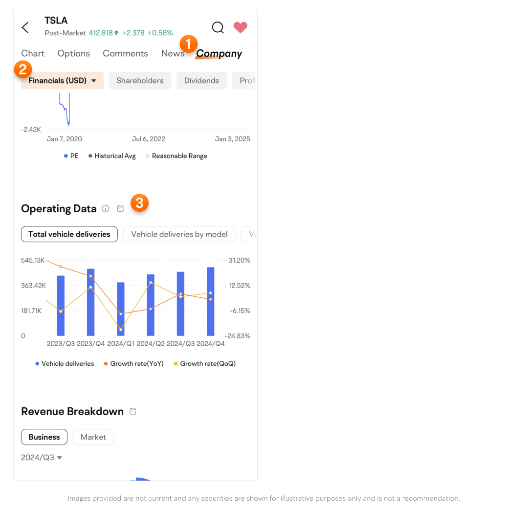 Path: Quotes page > Company > Financials > Swipe up to view Operating Data.