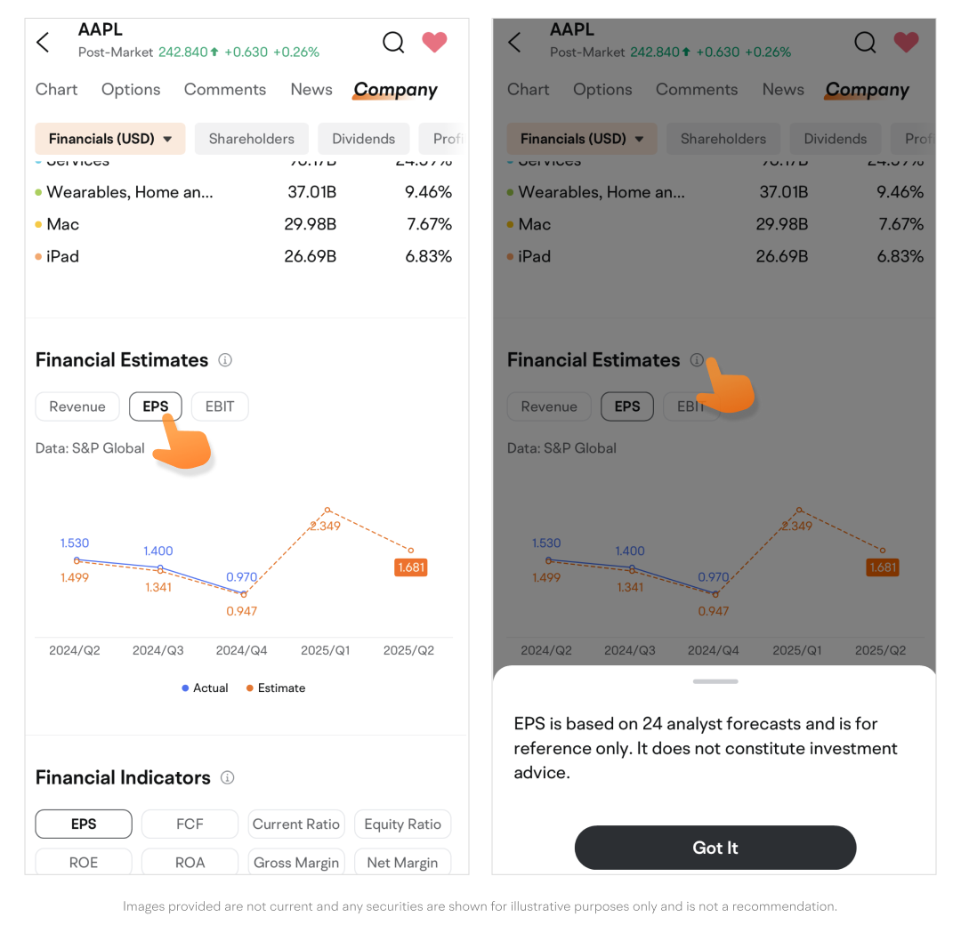• Tap the ⓘ icon next to Financial Estimates to view the number of analysts contributing to the projections.