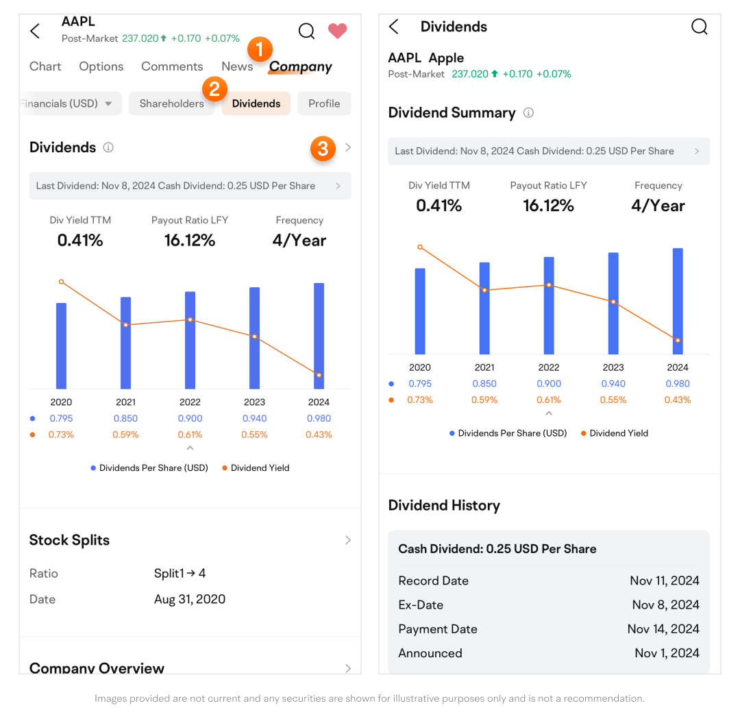 Path: Quotes page > Company > Dividends. To view more data, tap the ">" icon.