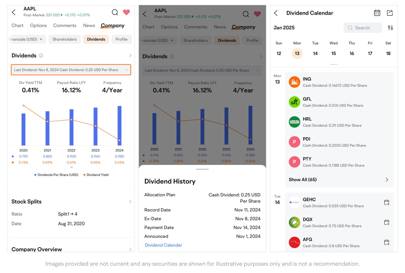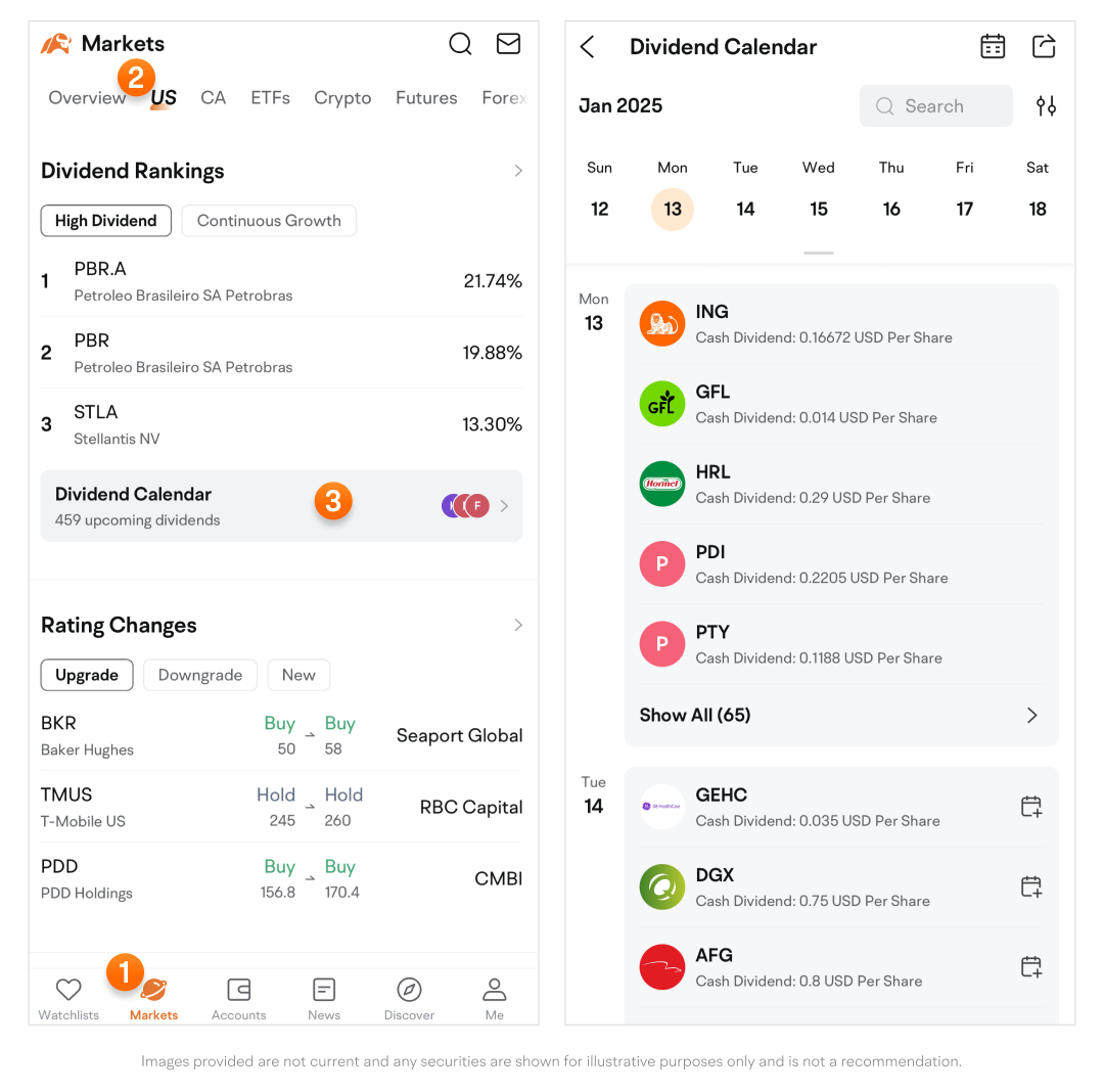 Path 2: Markets > US or select another market > Dividend Calendar. Tap a company to view more.