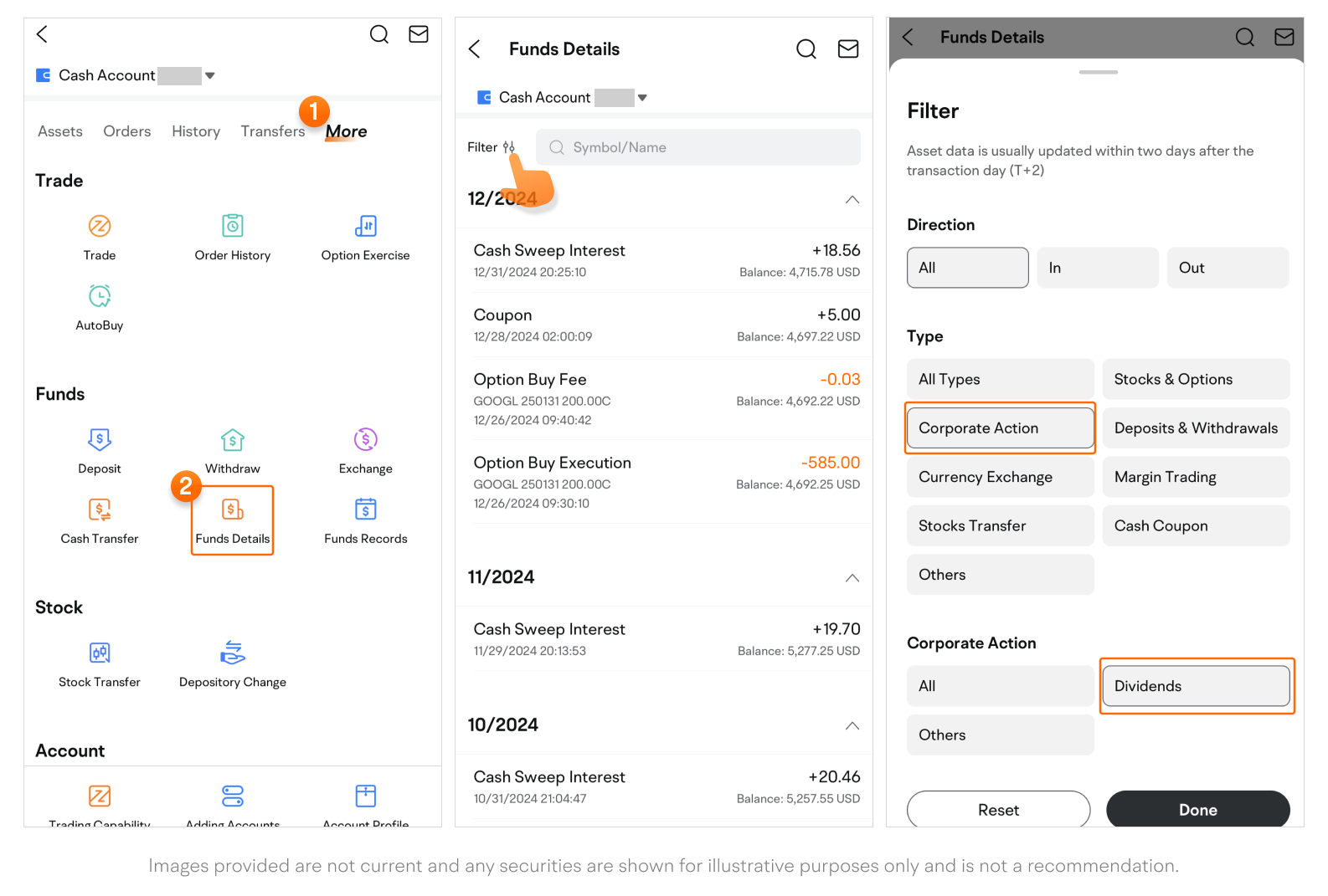 To view the dividend details in your account, go to Accounts > More > Funds Details. On the details page, tap the "Filter" icon, then swipe up and select Corporate Action and Dividends.