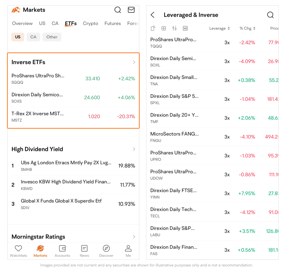Tap the Filter icon to screen ETFs by underlying index and leverage.
