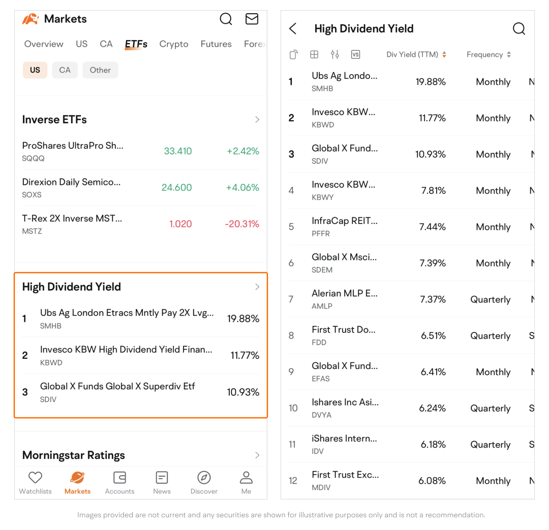 The section presents ETFs sorted by dividend yield, showcasing three high-yield ETFs by default.