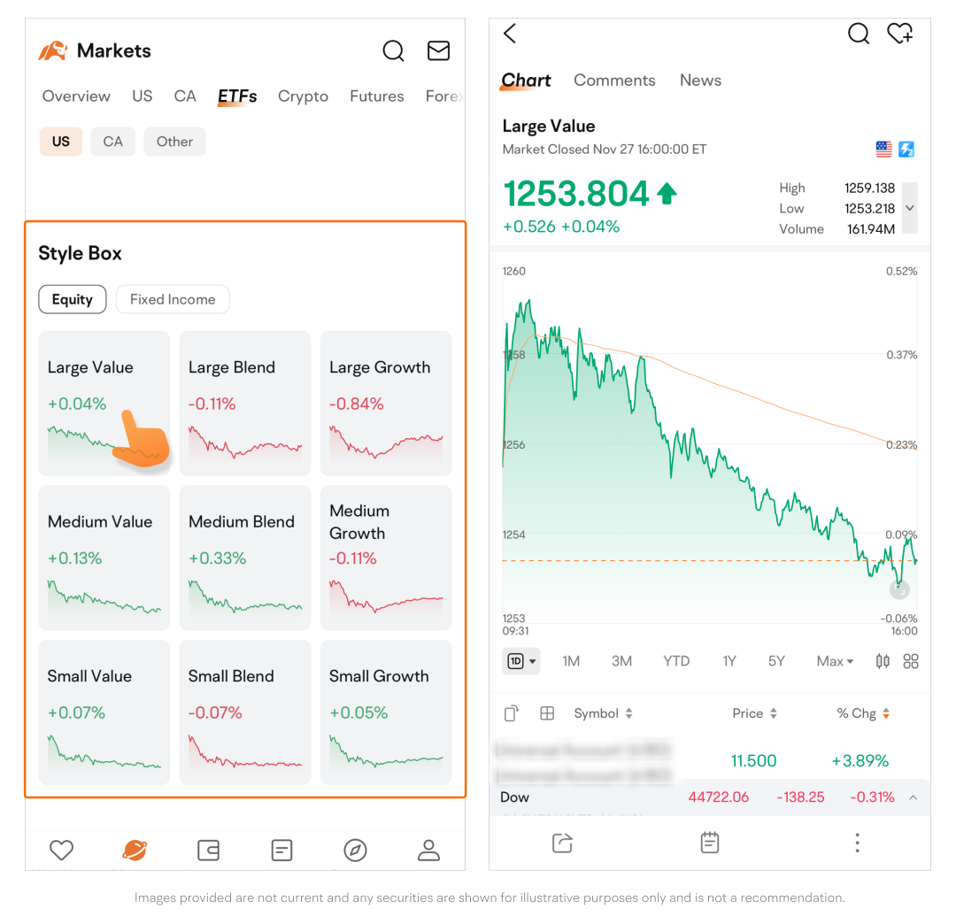 Style Box allows you to quickly pick out equity and fixed-income ETFs that match your investing preferences with a 3x3 style grid.