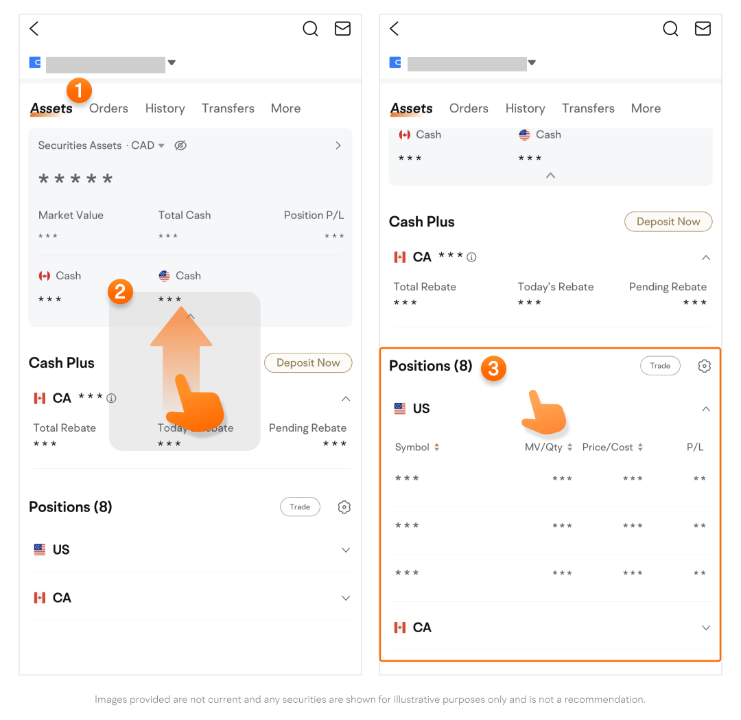 • Tap a position's symbol to enter its quotes page. Tap any info column to display an action bar with shortcuts.