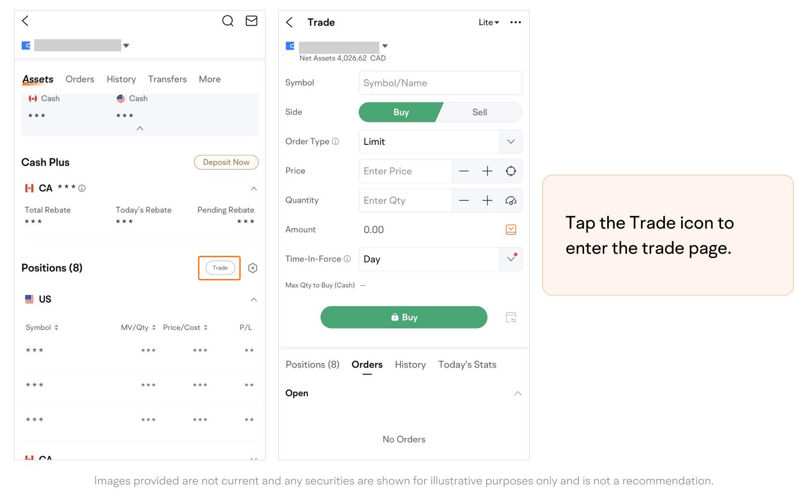 • Tap the Trade icon to enter the trade page.