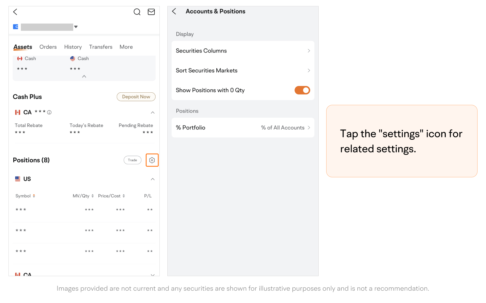 Located below the account overview, Positions section displays each position's symbol and info columns such as MV/QTY (market value/quantity) and Price/Cost.