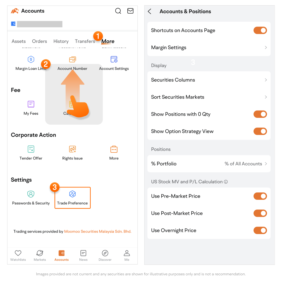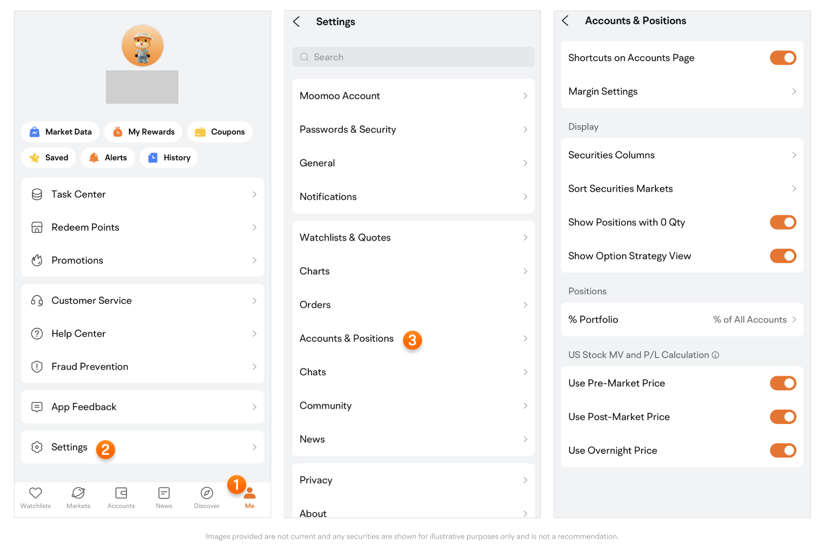 Path 1: Accounts > Tap an account card > More > Swipe up to find Accounts & Positions under Settings