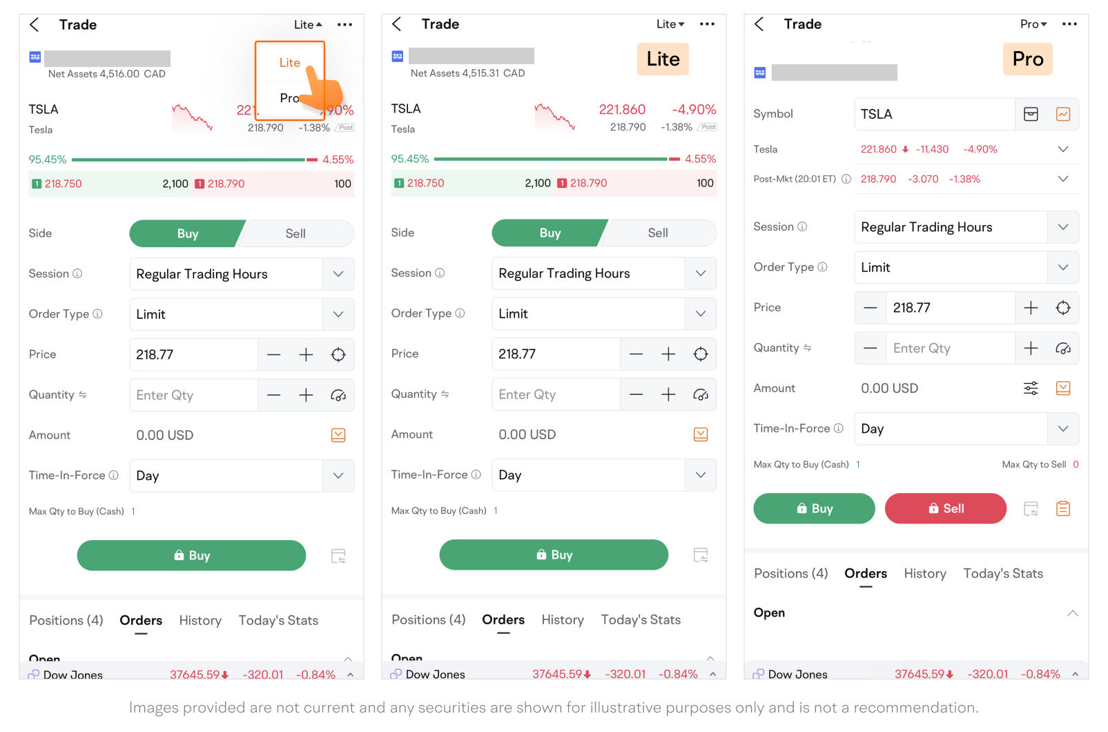 To switch modes, simply tap Lite or Pro at the top right of the trade page, then select your desired mode.
