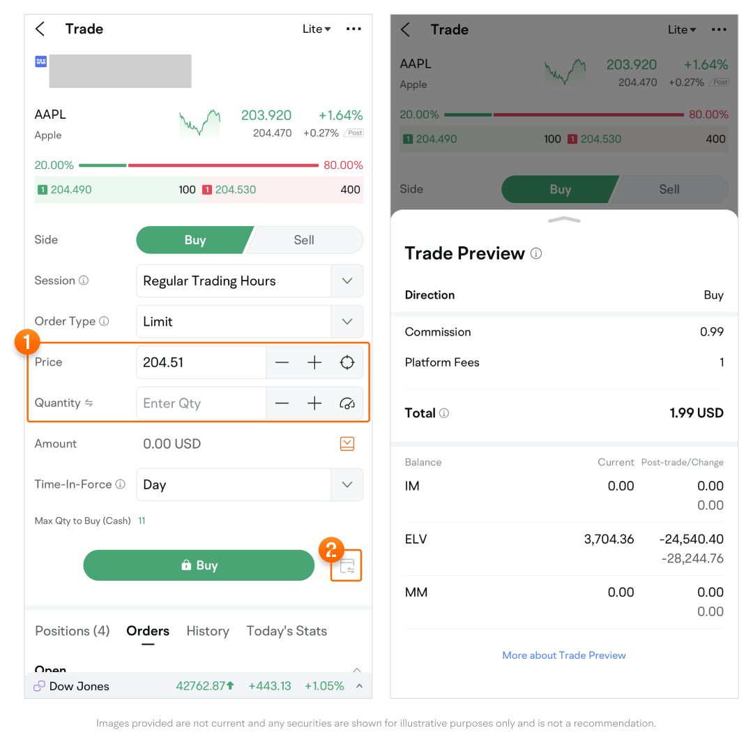 3. Tap the icon on the right of the Buy button to access Trade Preview.