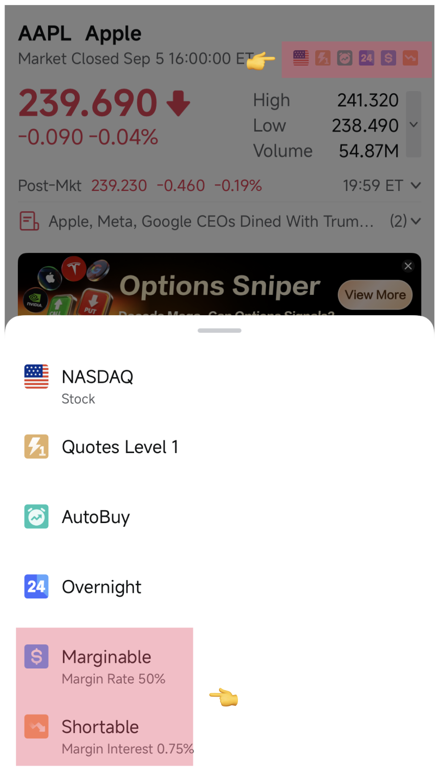 To see if a stock supports margin trading or short selling, simply tap the icons on its quotes page.