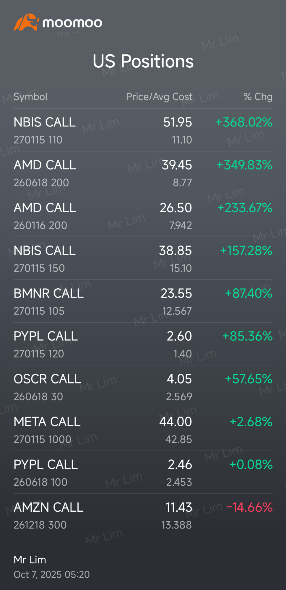 thats a nice lookin score card you got there.! Congrats on the AMD lottery ticket return with their hitting it out pf the park today. I havent seen AMD have a day like this in a number of years. It feels great when it happens though. So congrats! FWIW…. consensus seems to be that people got a little bit excited with the run up, and that they may be giving Altman 10% of the company’s interest for too little in return (I dont have the numbers in front of me right now, but it was for something around a terra watt of chip orders off the bat here, which sounds a little lean to me. There may be “some” blowback on the level of current quid pro quo on the deal until it ripens. Personally, Id probably sell the AMD options for the momemt to avoid any significant slipage on those juicy returns. …..See you tomorrow on BMNR…….Should be a wild day tomorrow. Im packed to the gills right now on BMNR and lovin every minute of it ! cheers!