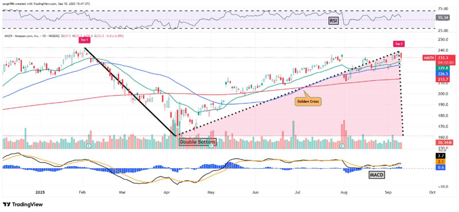 Th 50-day SMA line is currently running alongside the rising-wedge pattern's power trendline. Amazon is also seeing potential support at its 200-day SMA (the red line above) as well.