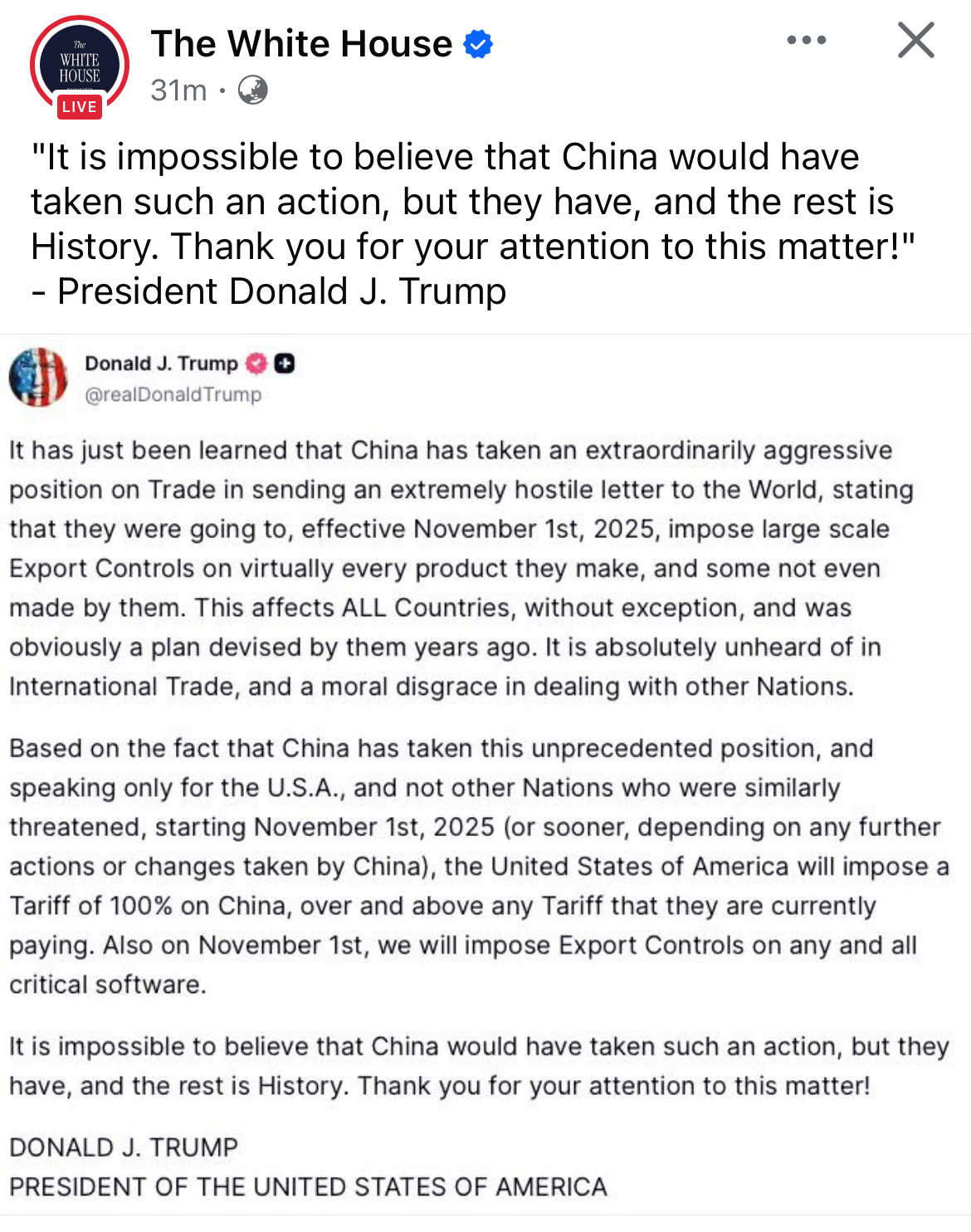 Donald Trump is in full force against China, imposing 100% tariff starting November 1st. Future market $E-mini S&P 500 Futures (DEC5) (ESmain.US)$ $E-mini NASDAQ 100 Futures (DEC5) (NQmain.US)$ and crypto $Bitcoin (BTC.CC)$ $Ethereum (ETH.CC)$ are down big reacting to this news.