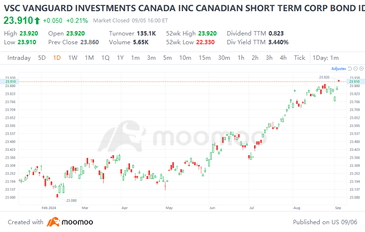 Furthermore, this ETF has a low management fee of just 0.1%, making it an ideal choice for investors in the Canadian short-term investment-grade corporate bond market. From June 5, 2024, to the present, VSC has increased by 2.18%. As of September 6, VSC's assets total CAD 909 million, with a dividend yield of 3.44%.