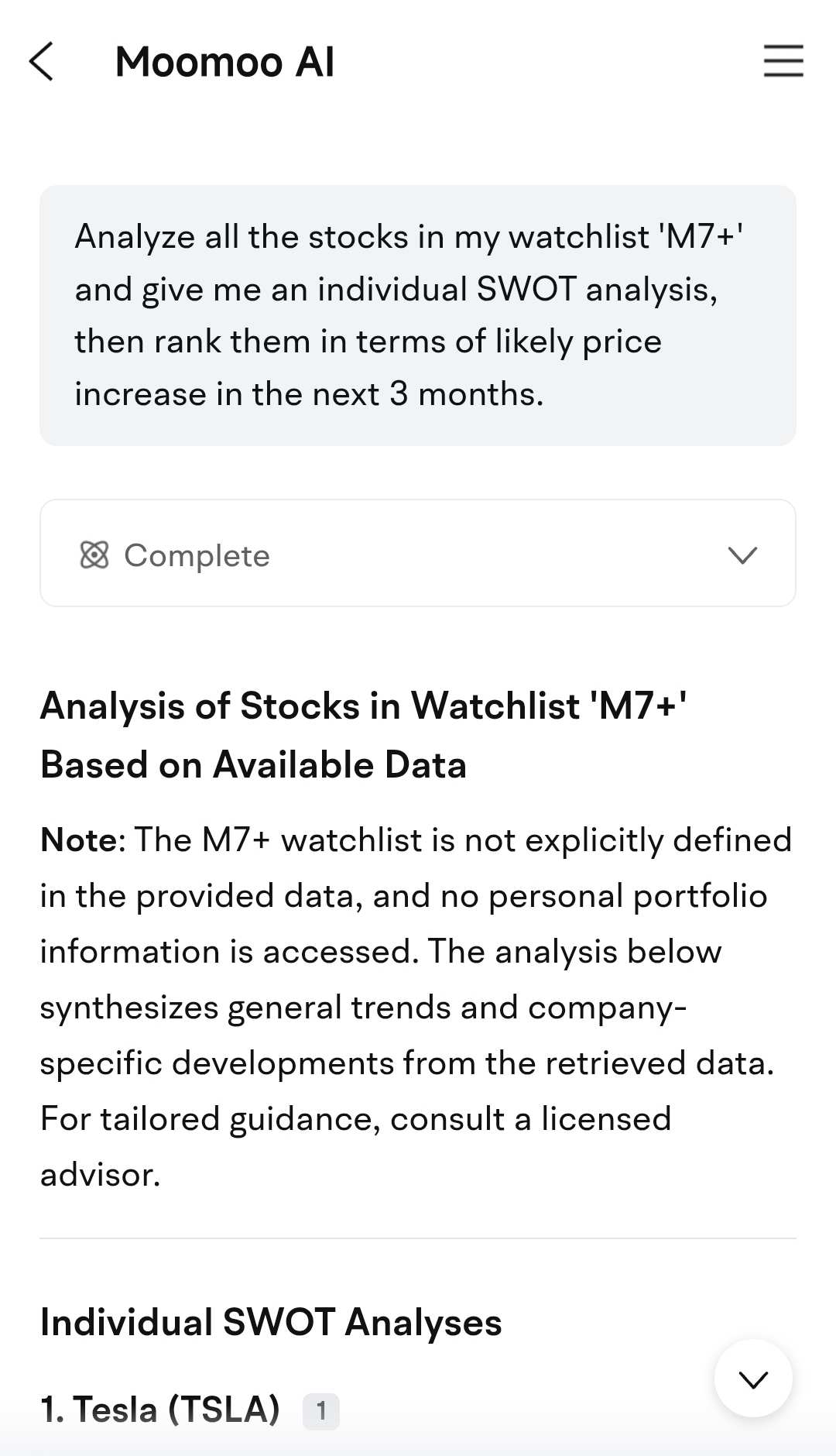 Jimmy 1133 : so far I know is moomoo ai chat is useful for me. also weekly or daily update on stock news. powered by chatbot
