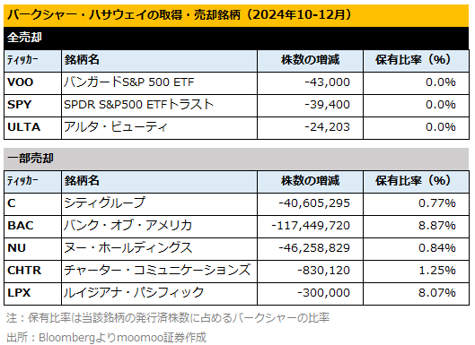 Berkshire sold all of the two ETFs linked to the S&P 500 Index in October-December 2024 ( $Vanguard S&P 500 ETF (VOO.US)$ and $SPDR S&P 500 ETF (SPY.US)$ ). $Bank of America (BAC.US)$ や $Citigroup (C.US)$ ETC reduced positions in financial stocks. Investors were focusing on this. $Apple (AAPL.US)$ There were no additional sales regarding this.
