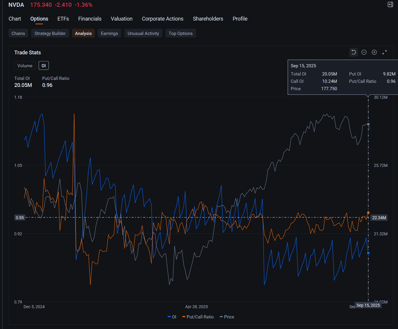 The number of outstanding Nvidia put options, or the so-called open interest rose to 9.82 million contracts as of Monday, from the 20-day average of 9.11 million contracts. The latest total is about 96% of the call options open interest, the highest ratio in almost two months, exchange data tracked by moomoo showed.